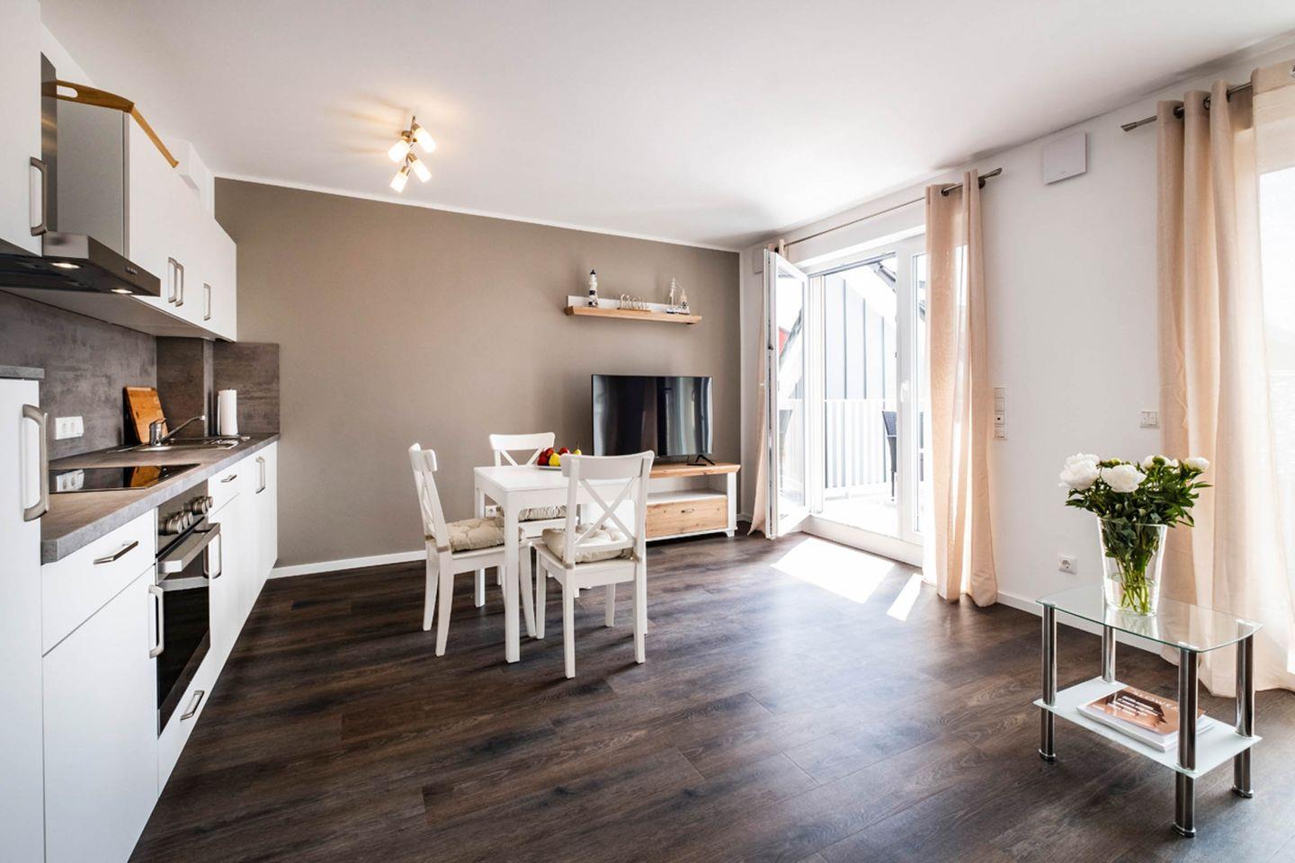 Aufgeteilt ist das Apartment in einen Wohn- und Essbereich mit offener Küche. Von dem Wohnbereich gelangen Sie auf den kleinen Balkon. Die Küche ist mit einem Herd, Backofen und einer Mikrowelle ausgestattet. Das Tageslichtbad verfügt über eine bodengleiche Dusche und einen Handtuchheizkörper. Im gemütlichen Schlafzimmer befindet sich ein Doppelbett (Boxspringbett) und ein Kleiderschrank.