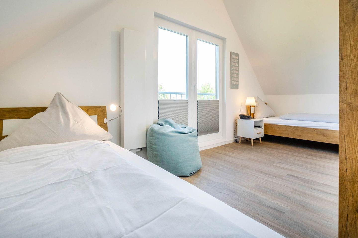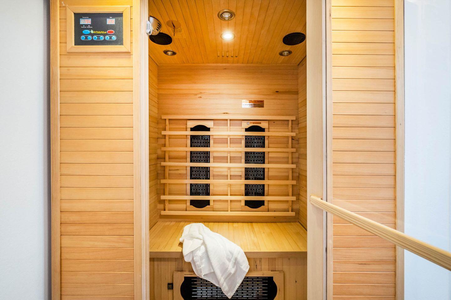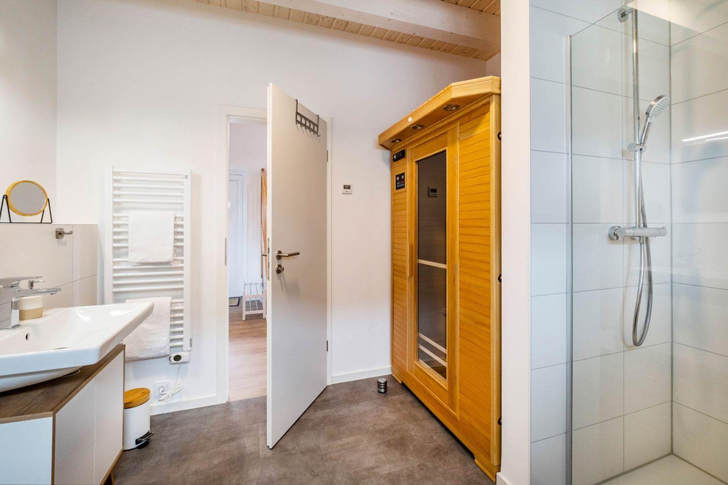 Weiterhin befindet sich im Erdgeschoss ein Duschbad mit Infrarotkabine. Nach einem ausgiebigen Spaziergang in der Natur kann man hier wieder Kräfte tanken! Auch ein Schlafzimmer mit einem bequemen Boxspring-Doppelbett ist hier vorhanden, das an Gemütlichkeit nicht zu übertreffen ist.
