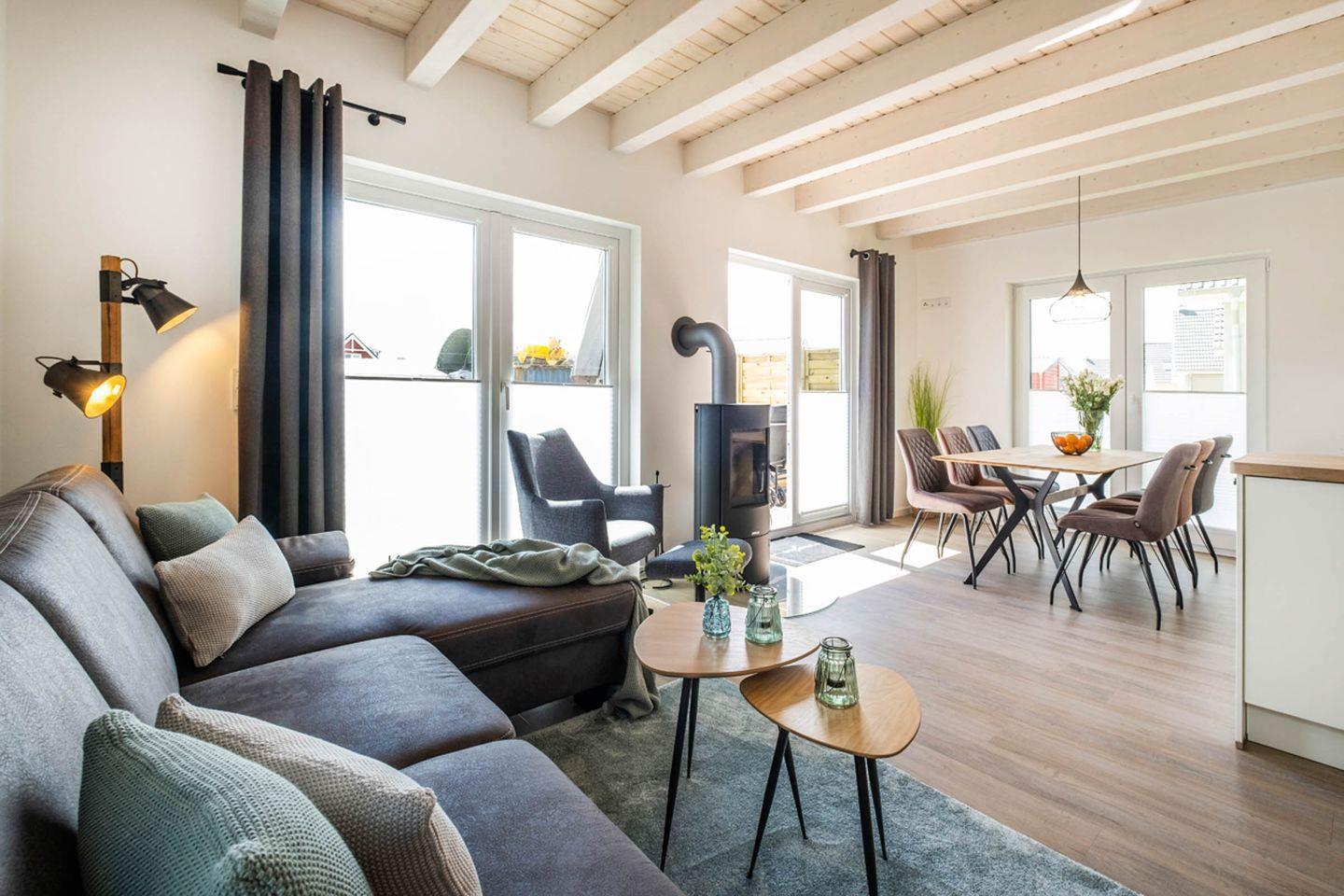 Das Wohnzimmer mit offener Küche strahlt Behaglichkeit aus, so dass sich jedermann sofort beim Betreten des Ferienhauses wie zuhause fühlt. Ein gemütliches Sofa und ein bequemer Fernsehsessel laden zum Erholen ein. Ein großer Flatscreen-Fernseher sorgt für die Unterhaltung!