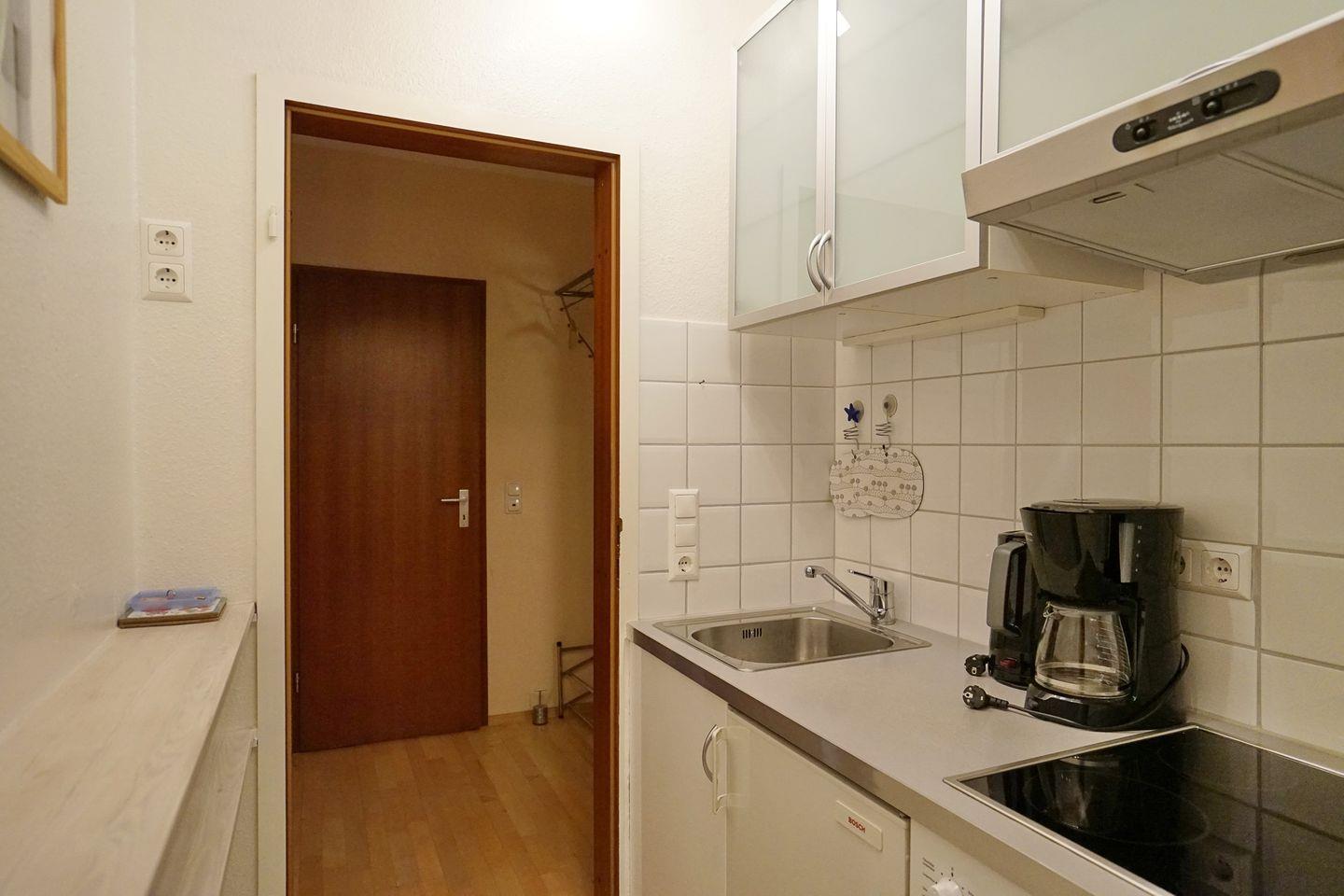 Duschbad und einer kleinen Küche. Die Küche ist ausgestattet mit Backofen und