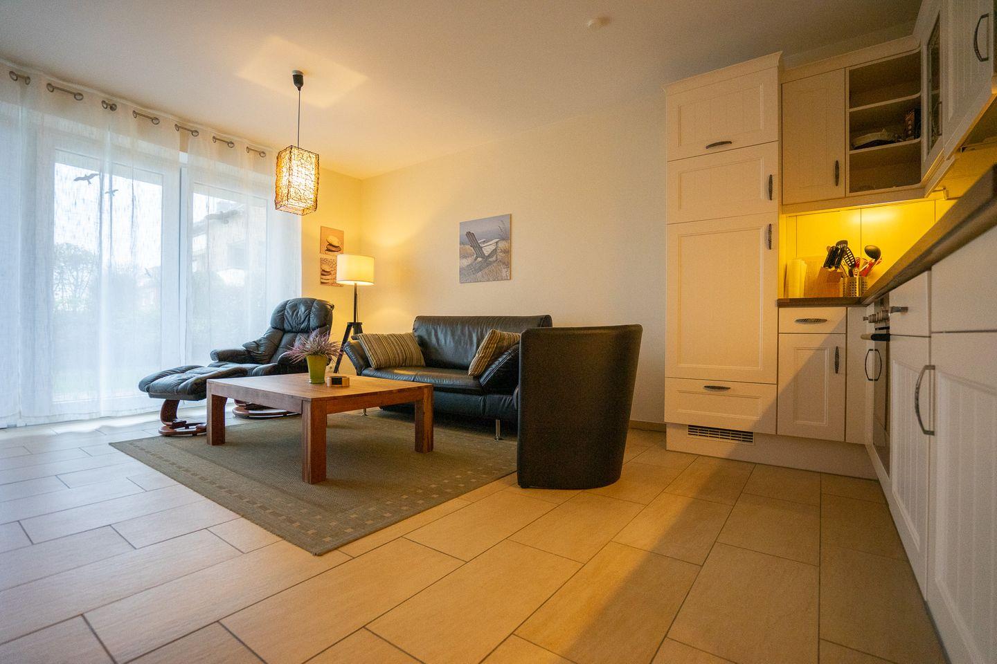 Vom Eingang der Unterkunft aus gelangen Sie in das helle, stilvolle Wohnzimmer, in dem sich auch die neu ausgestattete Küchenzeile befindet, u. a. mit Geschirrspüler und Backofen.