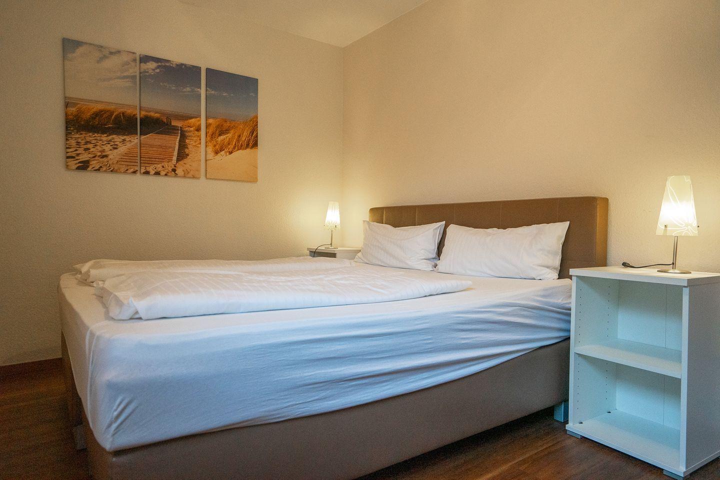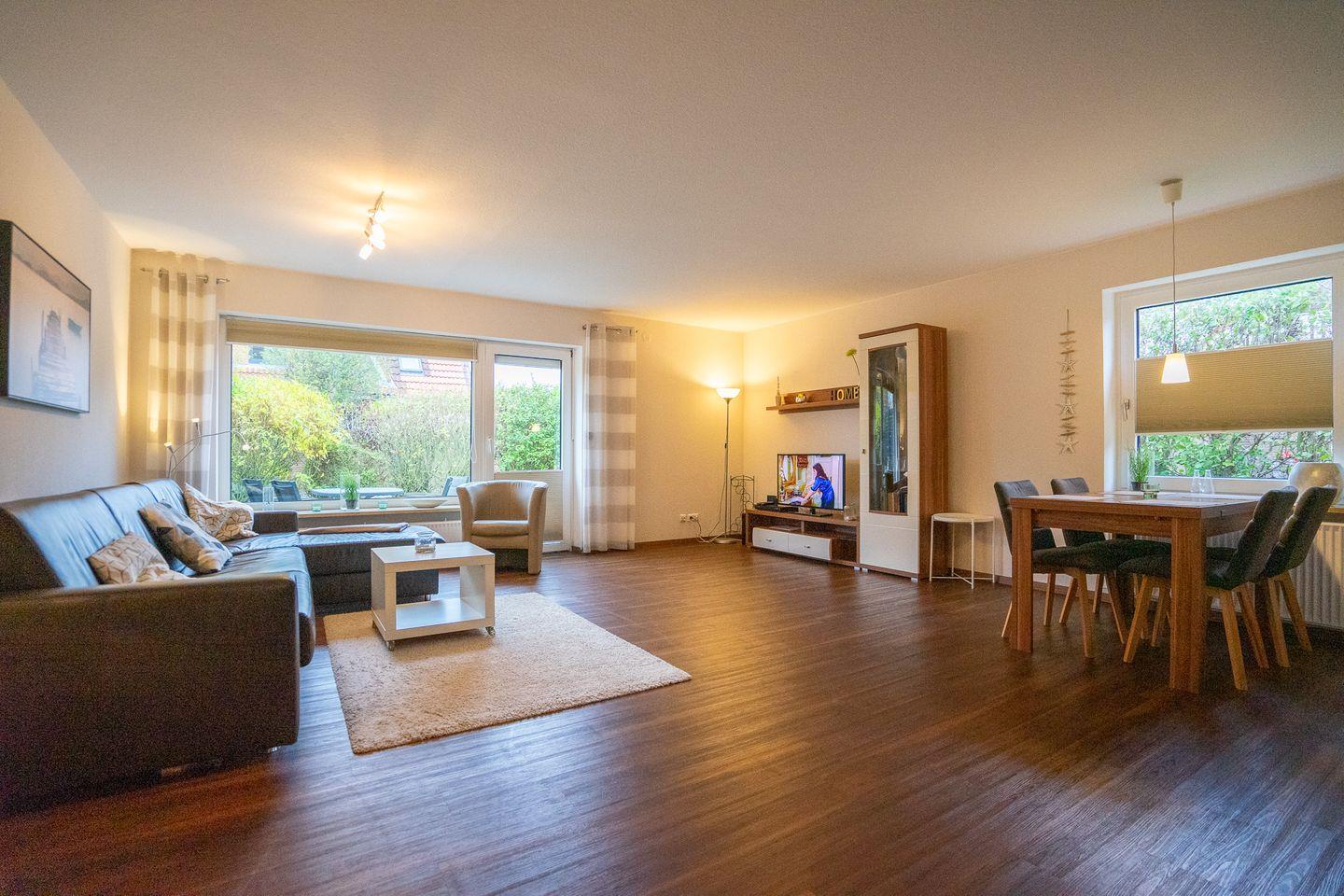 Die Wohnung Nordseetraum 3 befindet sich im EG und verfügt über eine Terrasse mit Terrassenmöbeln, ein Schlafzimmer, eine Küchenzeile, ein Duschbad und einem Wohn-/Schlafraum mit einer hochwertigen Doppelschlafcouch. Die Küchenzeile ist mit einem Backofen, einem Geschirrspüler, einer Kühl-/Gefrierkombination und weiterem