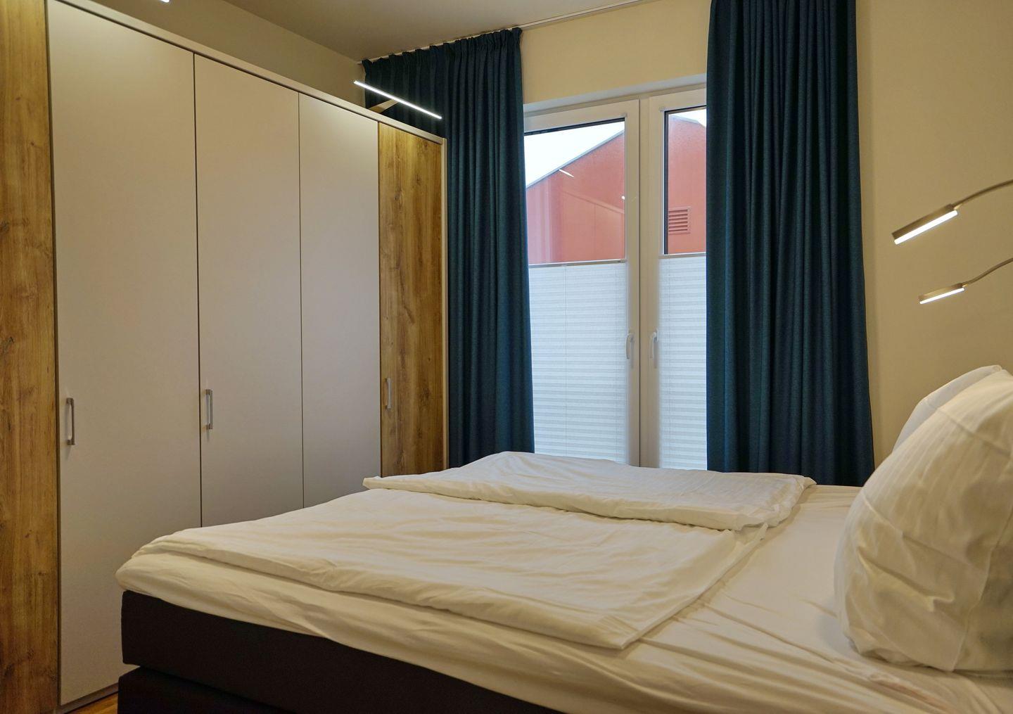 Es gibt zwei Schlafzimmer, eins mit einem 1,80 x 2,00m Bett (durchgehender Topper) und eins mit einem 1,80 x 2,00m Bett (Einzelmatratzen). Das eine Schlafzimmer hat noch einen extra Fernseher