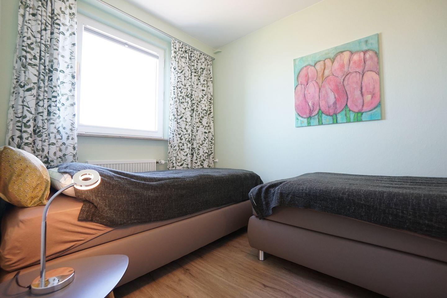 Die zwei Schlafzimmer sind mit einem Doppelbett bzw. zwei Einzelbetten ausgestattet.