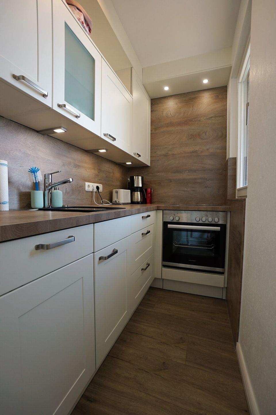 Im kleinen, aber feinen Badezimmer finden Sie eine herrliche Regendusche vor. Die Küche ist komplett ausgestattet.