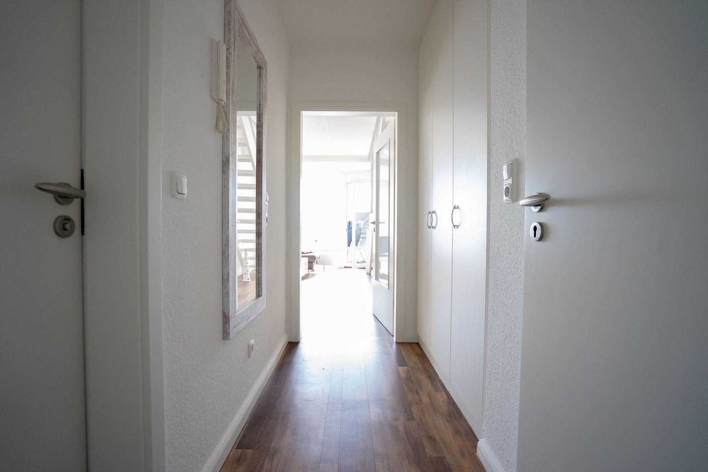 In der zweiten Etage erwartet Sie das lichtdurchflutete Wohnzimmer mit offener Küche, ein Schlafzimmer mit Doppelbett sowie das Badezimmer.