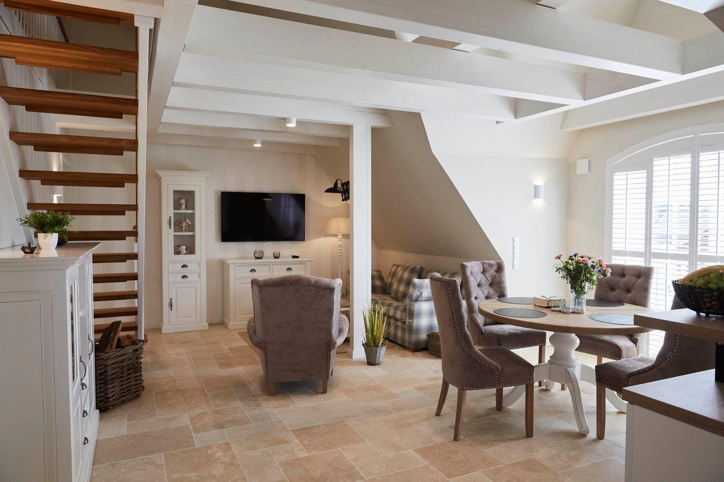 Die Wohnung besticht durch seine 2 Schlafzimmer, aufgeteilt auf 2 Etagen. Das Schlafzimmer in der zweiten Etage befindet sich in einer offenen Galerie. Neben hochwertigen Designer-Möbeln, modernster Technik, wie Power W-LAN, eine energetische Lüftungsanlage und Smart-TVs, verfügt das gesamte Objekt über eine Fußbodenheizung. Die edlen Shutter rahmen die dreifachverglasten Fenster perfekt ein.