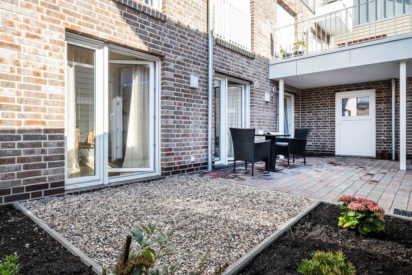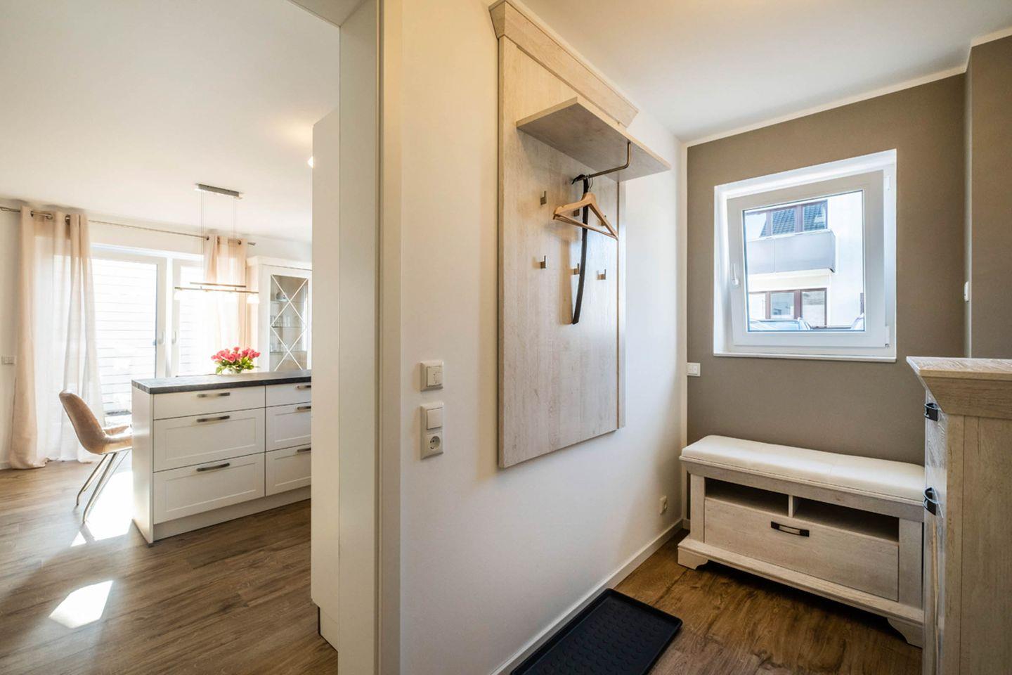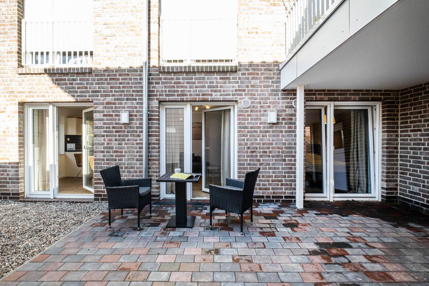 Aufgeteilt ist das Apartment in einen Wohn- und Essbereich mit offener Küche. Von dem Wohnbereich gelangen Sie auf die Terrasse. Die Küche ist mit einem Herd, Backofen und einer Mikrowelle ausgestattet. Das Tageslichtbad verfügt über eine bodengleiche Dusche und einen Handtuchheizkörper. Im gemütlichen Schlafzimmer befindet sich ein Doppelbett (Boxspringbett) und ein Kleiderschrank.