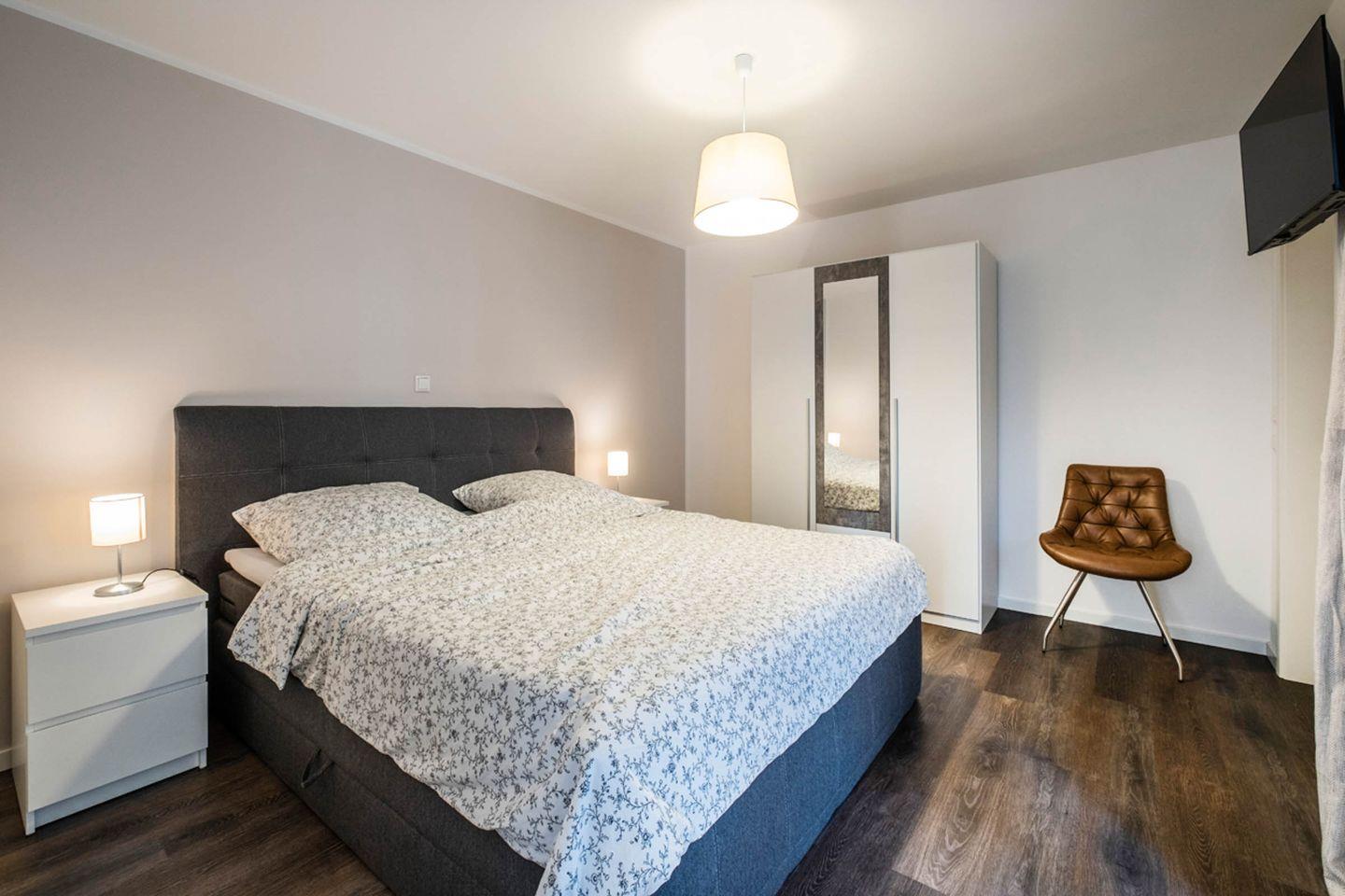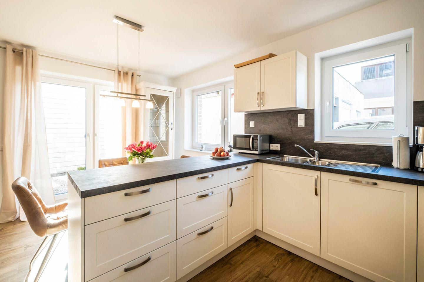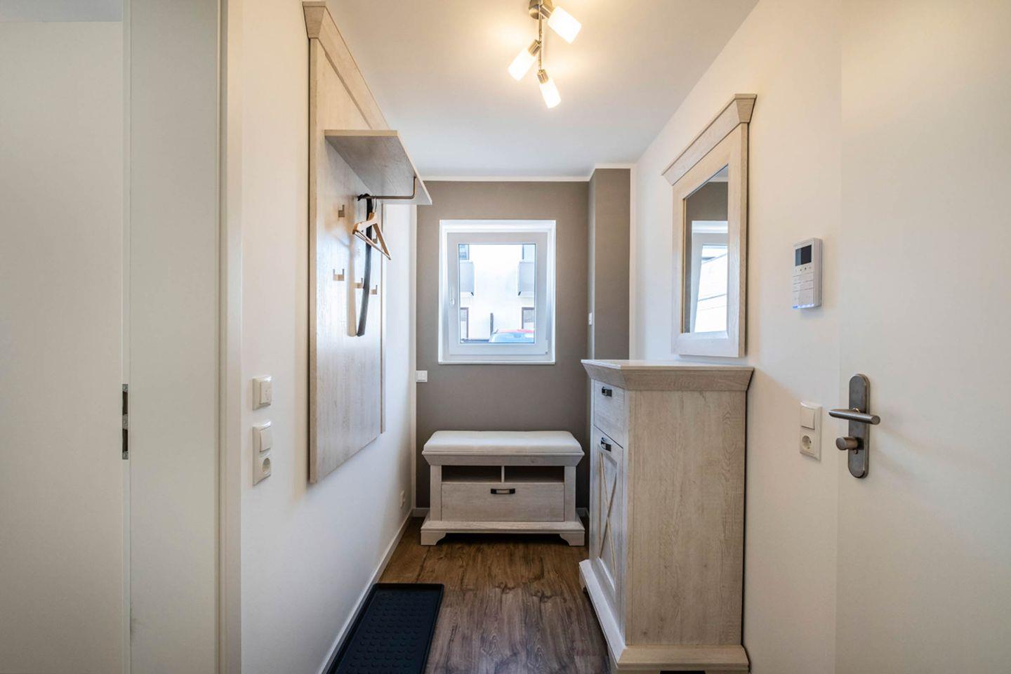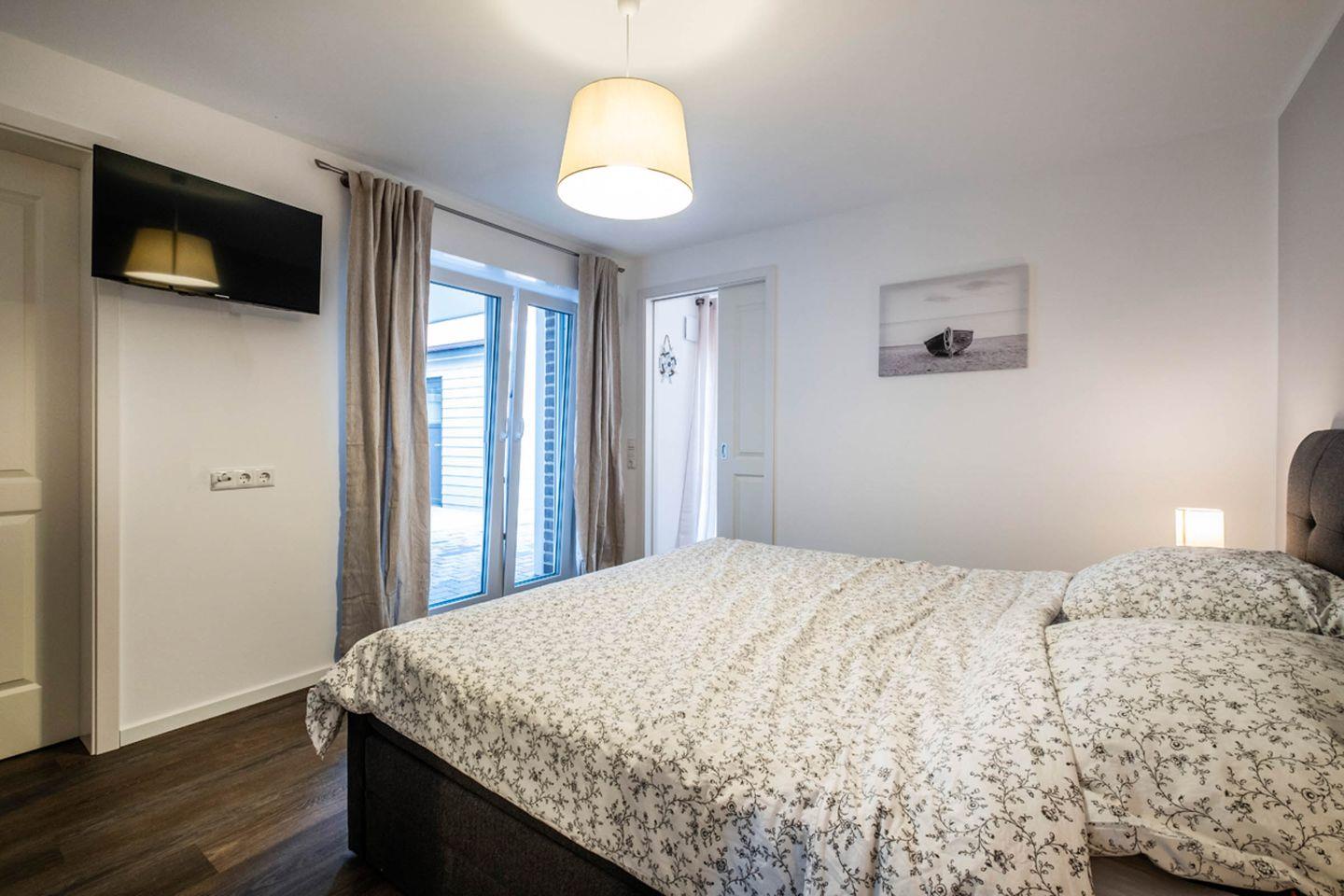 Aufgeteilt ist das Apartment in einen Wohn- und Essbereich mit offener Küche. Von dem Wohnbereich gelangen Sie auf die Terrasse. Die Küche ist mit einem Herd, Backofen und einer Mikrowelle ausgestattet. Das Tageslichtbad verfügt über eine bodengleiche Dusche und einen Handtuchheizkörper. Im gemütlichen Schlafzimmer befindet sich ein Doppelbett (Boxspringbett) und ein Kleiderschrank.
