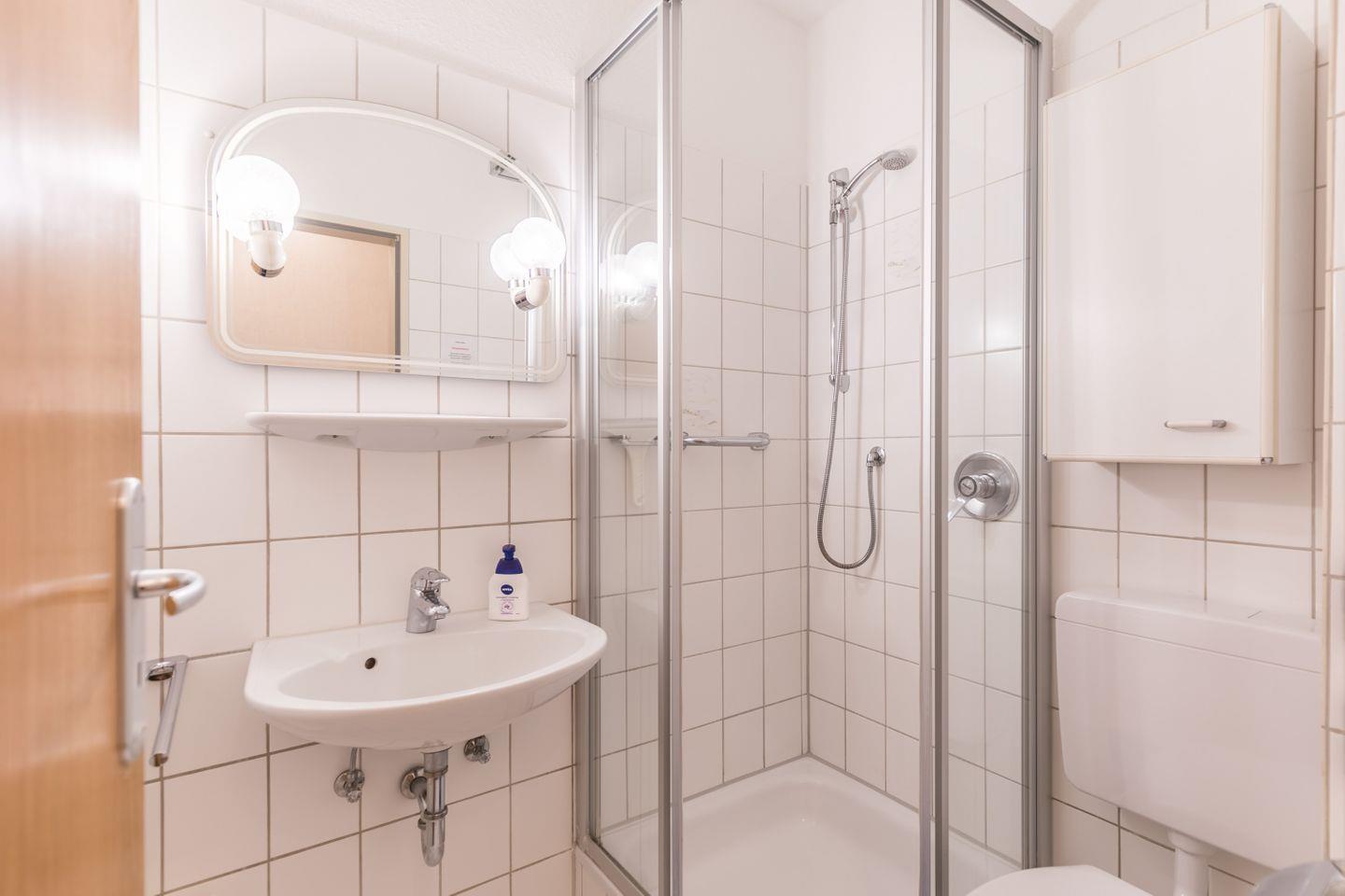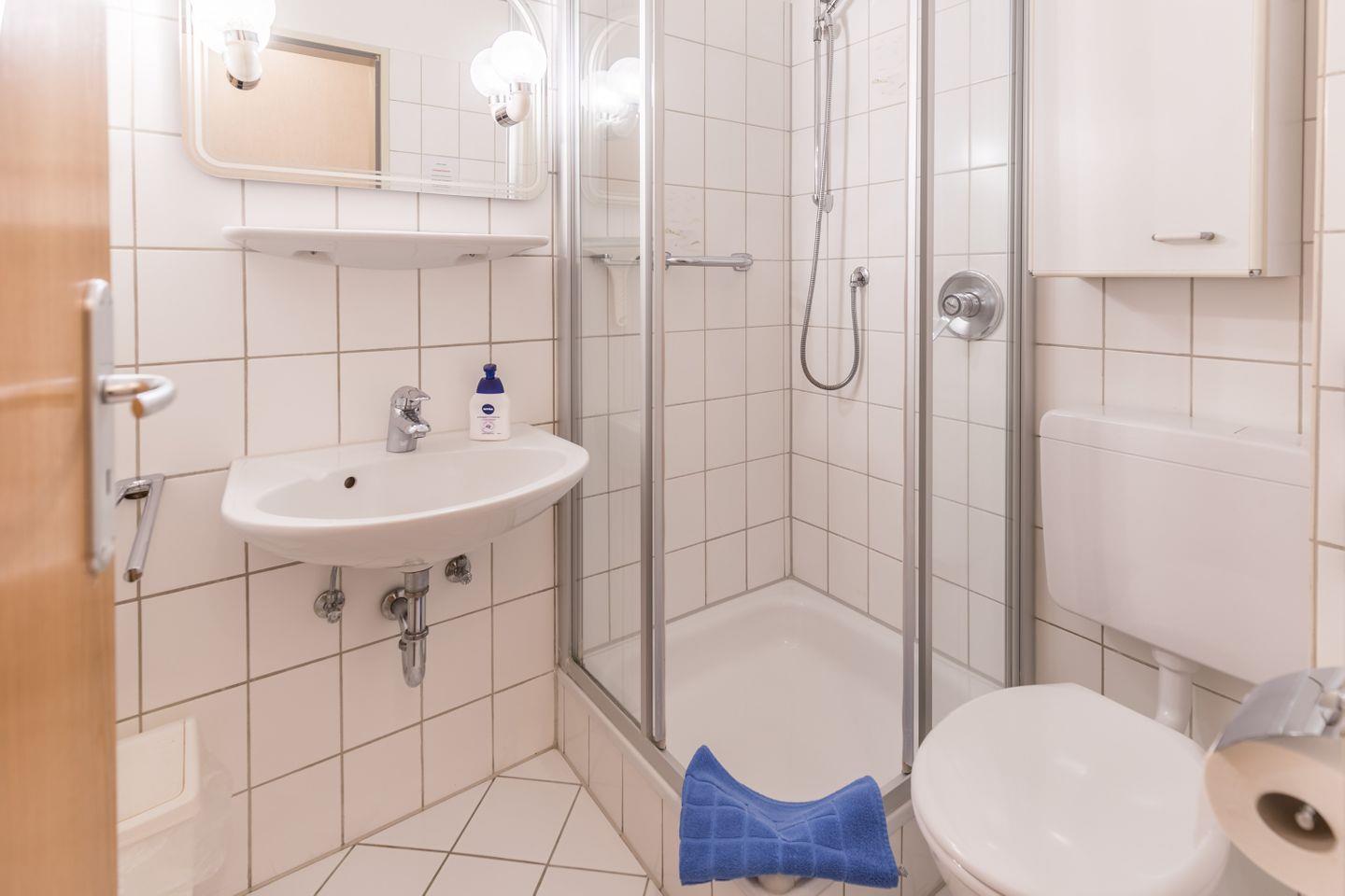 Dusche, WC, Spiegel, Waschbecken, Haartrockner, Hängeschrank, Abluft