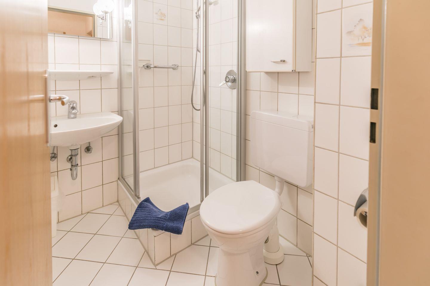 Dusche, WC, Spiegel, Waschbecken, Haartrockner, Hängeschrank, Abluft