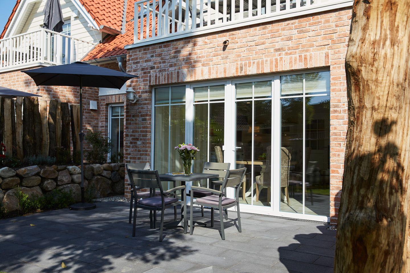 Die großzügige Terrasse, umrahmt von der schönen Außenanlage, lädt zur Entspannung ein.