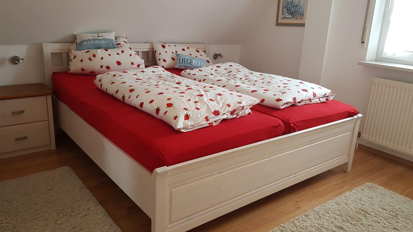 Ein großzügiges Schlafzimmer mit Doppelbett, die neuen hochwertigen Matratzen passen sich optimal an die jeweilige Schlafposition an, so ist eine erholsame Nacht garantiert. Da sich, wie überall in der Wohnung, Außenjalousien und Fliegengitter vor den Fenstern befinden.