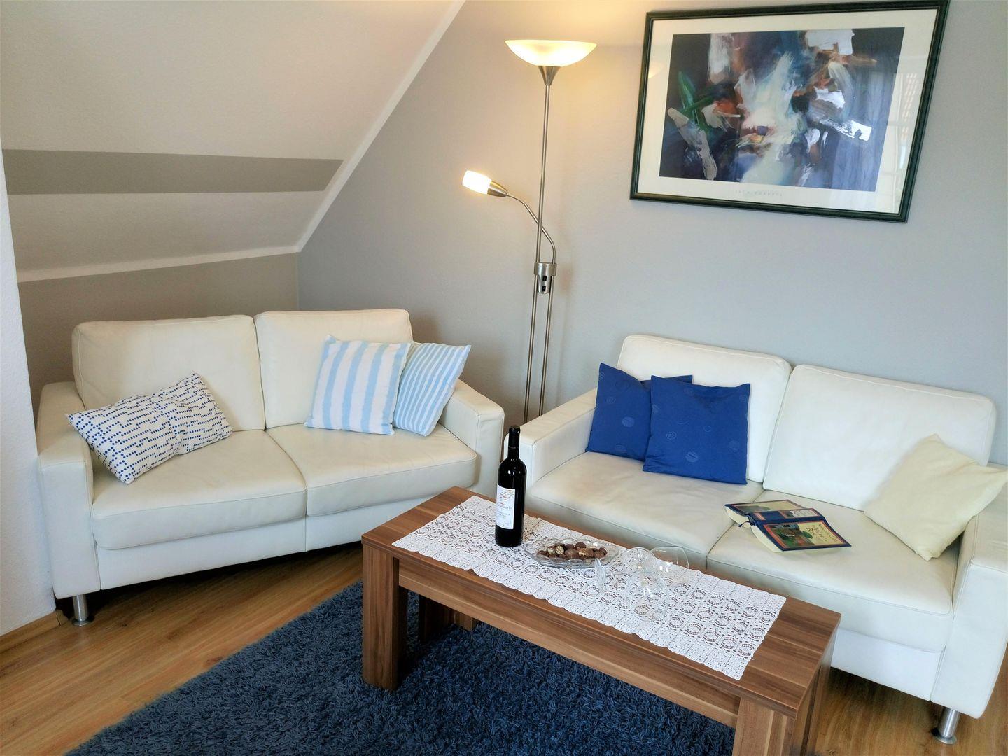 Zwei Sofas, ein bequemer Fernsehsessel, ein großer Fernseher oder Bücher stehen bereit , wenn das Wetter einmal nicht so schön ist. An dem Esstisch, in dem hellen Raum, kann man sich mit Köstlichkeiten aus der Region verwöhnen.