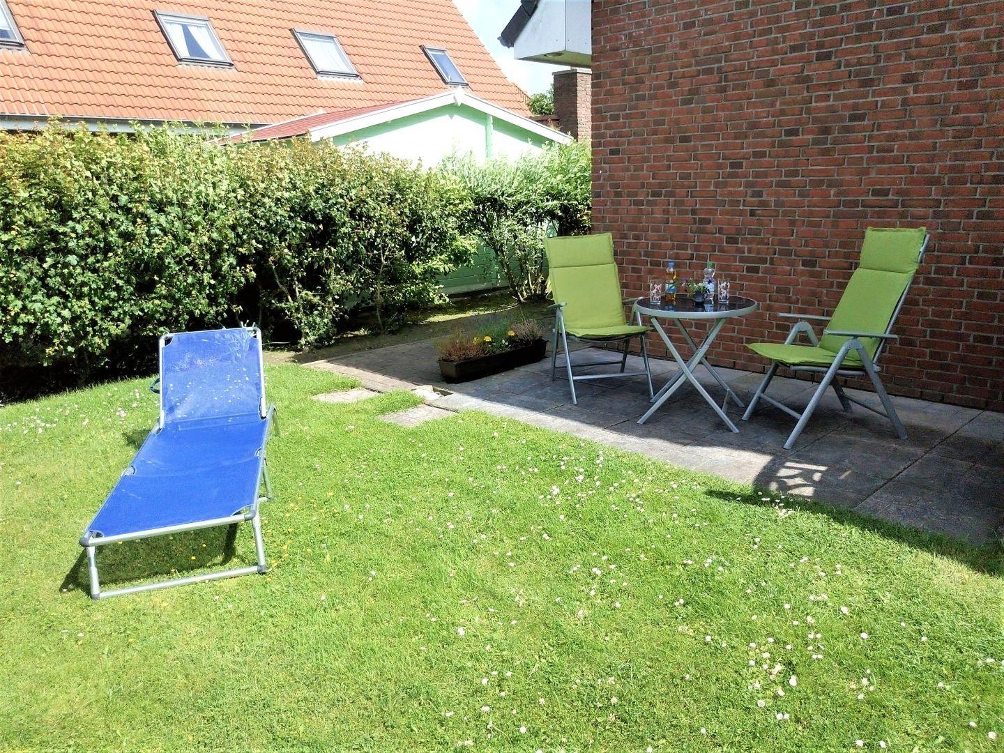 Im Garten steht Ihnen eine eigene Terrasse zur Verfügung, die mit Terrassenmöbeln und einem Strandkorb ausgestattet ist. Hier werden Sie sich bei schönem Wetter sicher sehr wohlfühlen.
