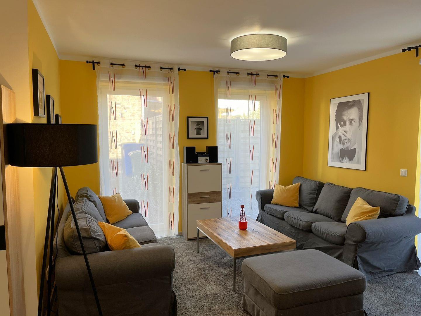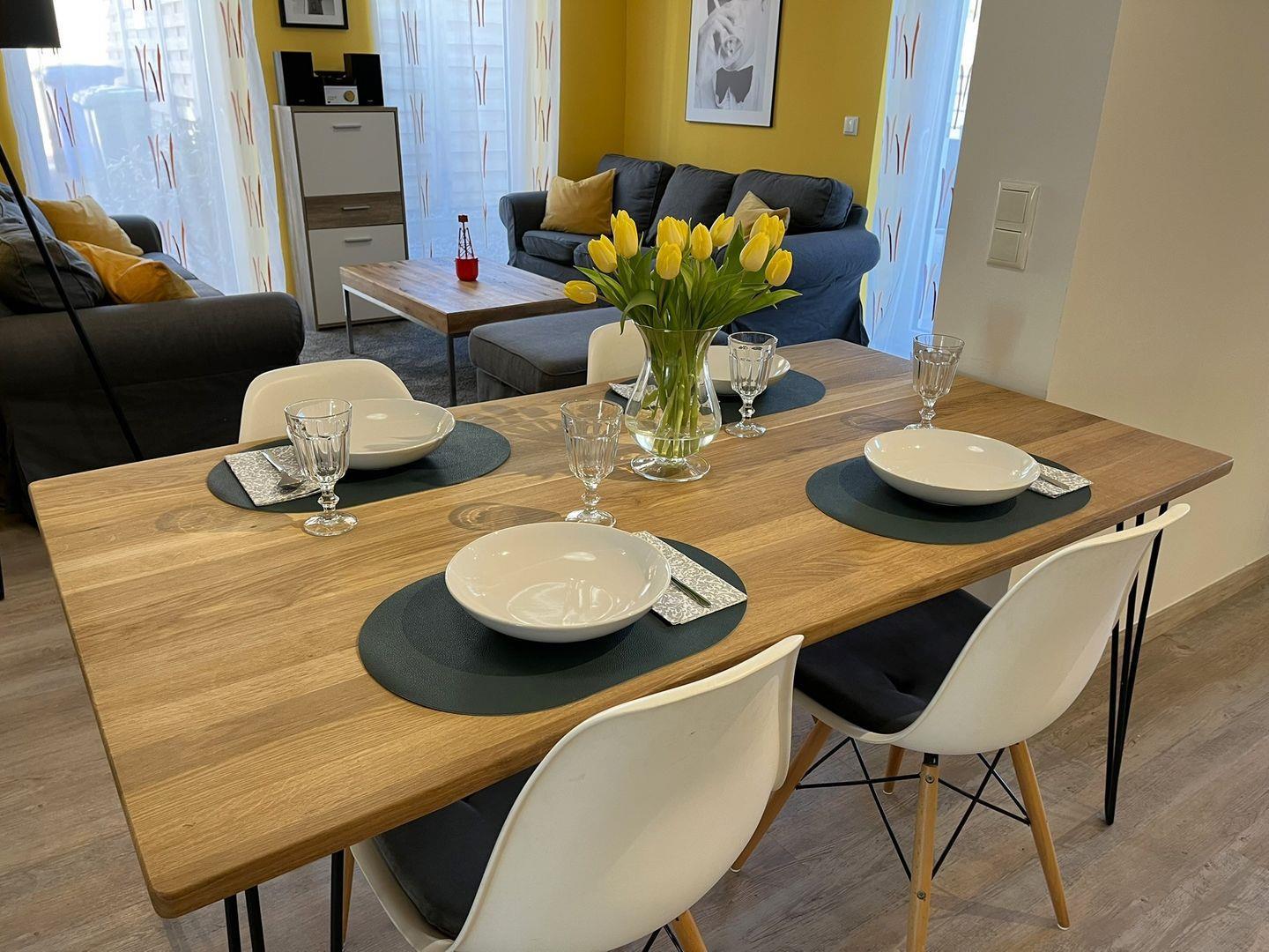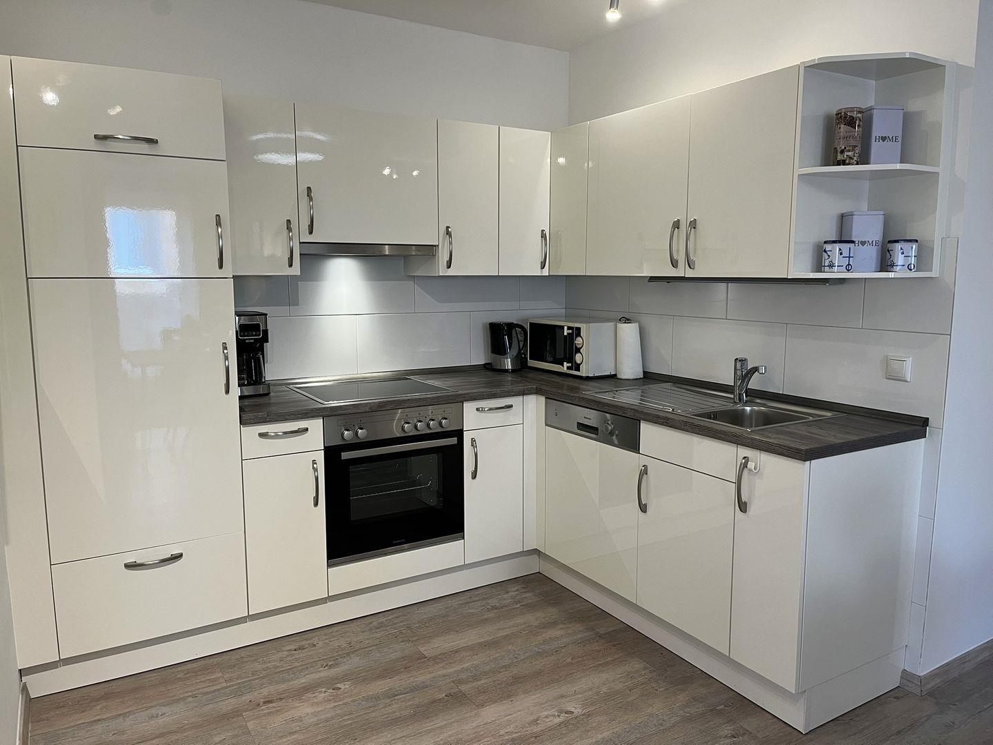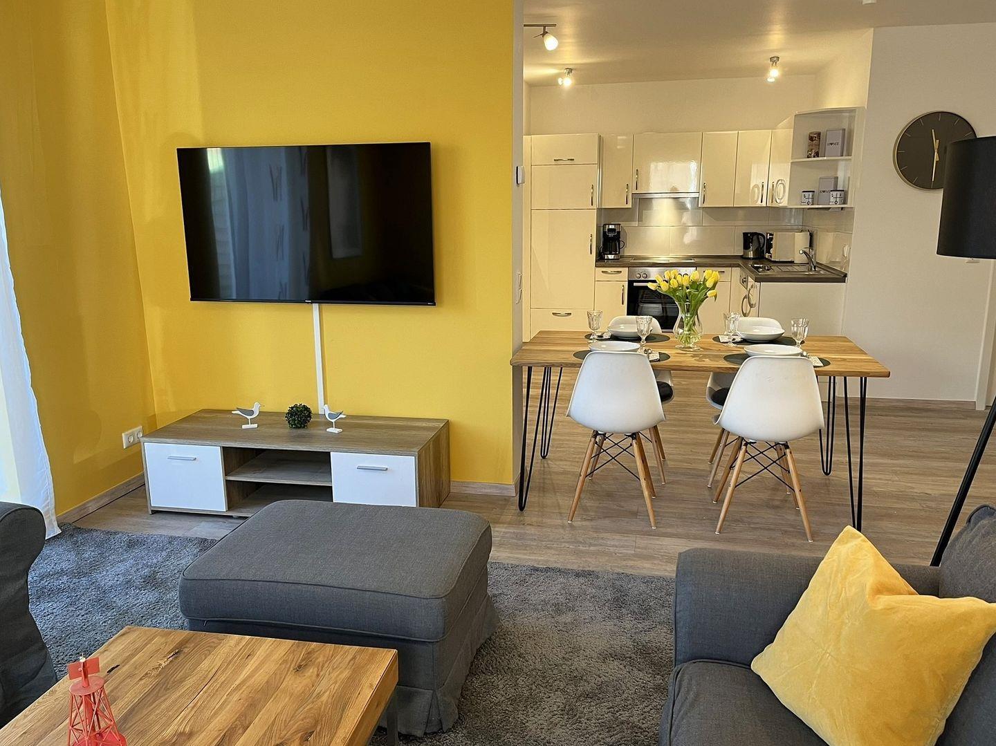 Die Wohnung besticht durch ihre offene und einladende Atmosphäre. Der großzügige Wohnbereich verfügt über eine bequeme Sofaecke, einen Essbereich und eine moderne, voll ausgestattete Küche – perfekt für gesellige Abende. Die Küchenausstattung umfasst alles, was Sie benötigen: Herd, Backofen, Geschirrspüler und Mikrowelle. So können Sie leckere Mahlzeiten zubereiten und die gemeinsame Zeit in vollen Zügen genießen.