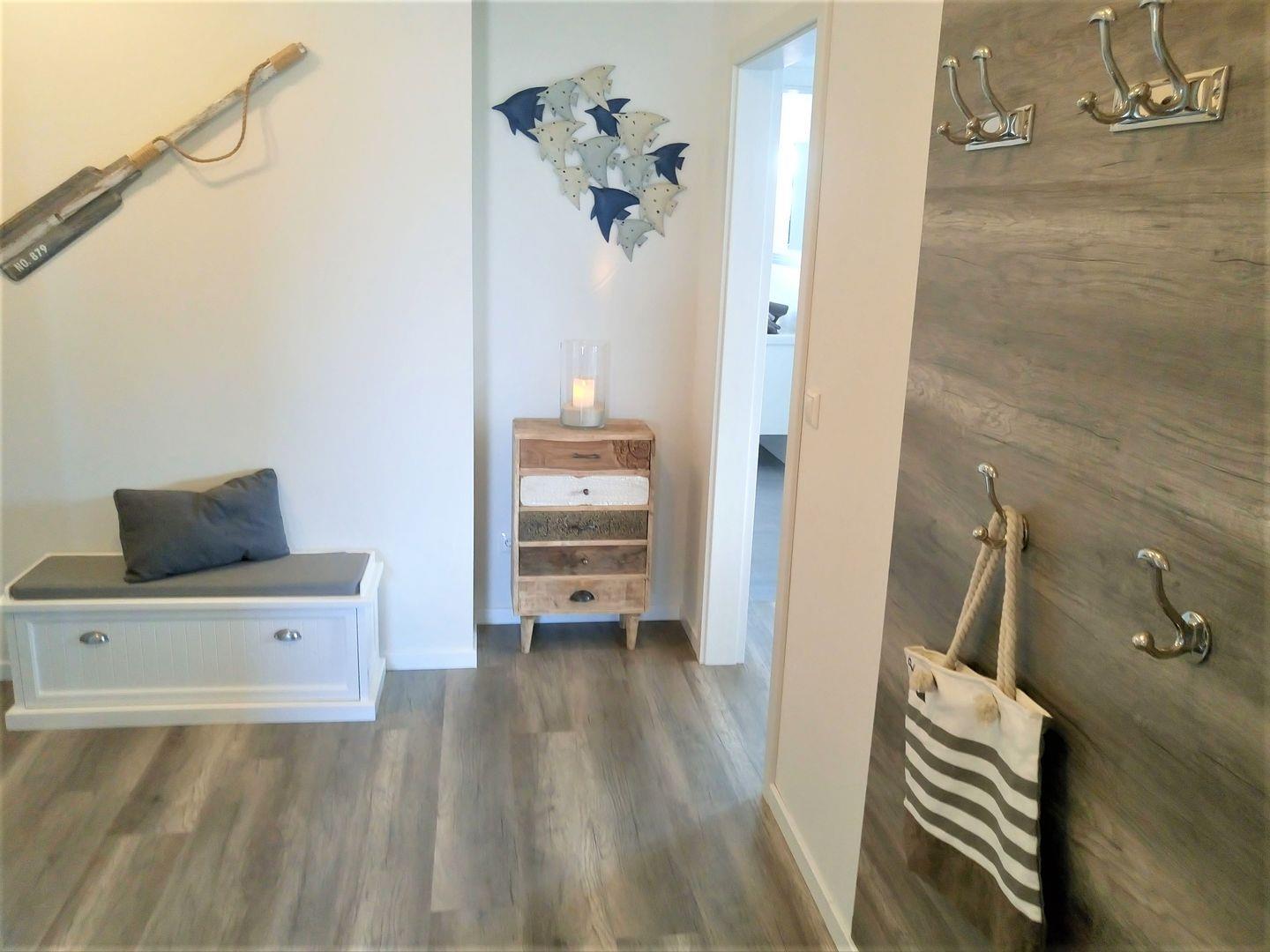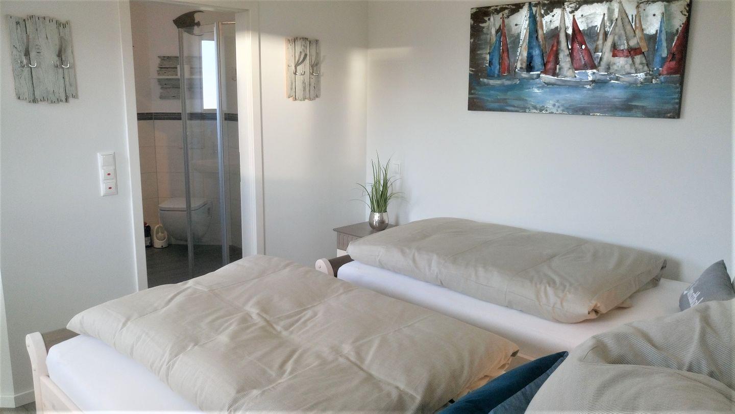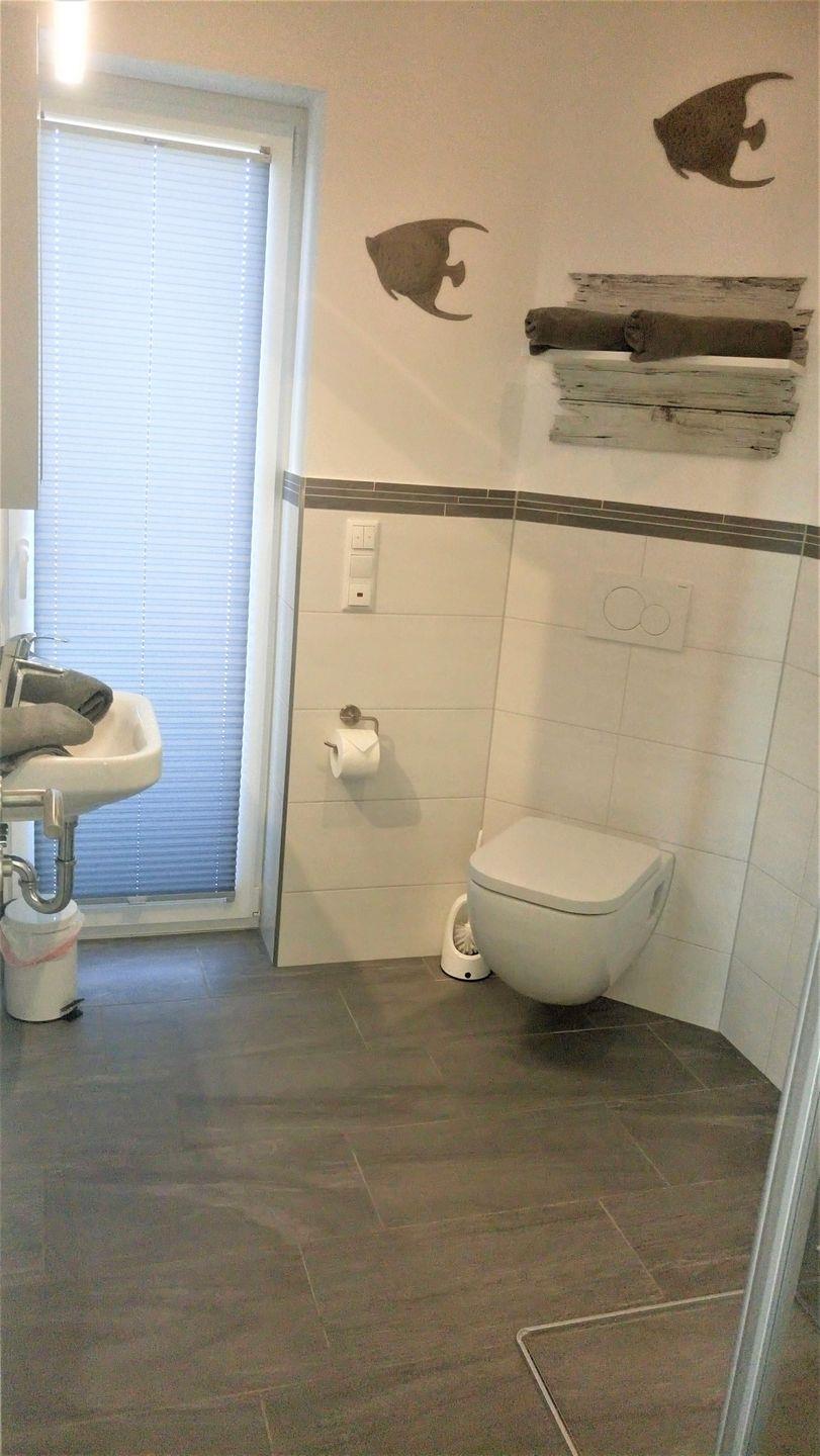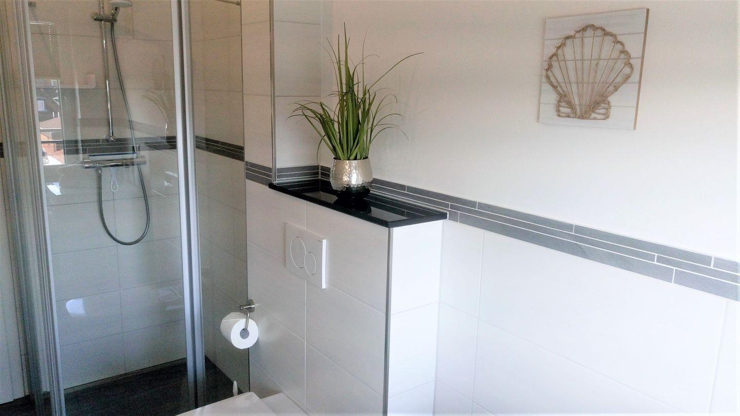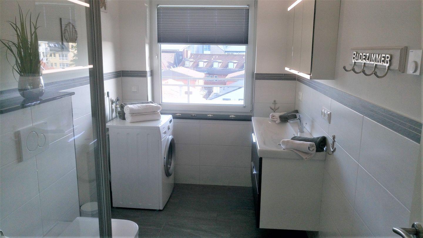 Ein zweites Tageslicht-Badezimmer mit geräumiger sowie bodengleicher Dusche und einer Waschmaschine, die gegen Gebühr genutzt werden kann, rundet diese Ferienwohnung ab und macht den Start in den Tag perfekt.