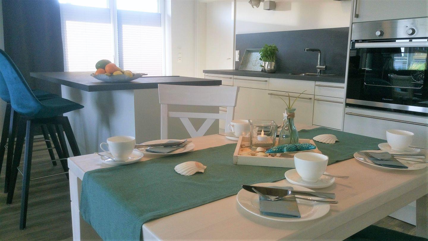 In dem modernen und mit viel Liebe eingerichtetem Wohn- Essbereich werden Sie sich sicher wohl fühlen. Bequeme Wohnzimmermöbel stehen Ihnen in der Chill-Ecke mit TV zur Verfügung. An dem Esstisch, vor der hochwertig und komplett eingerichteten Küchenzeile mit Kochinsel, können Sie sich die Zeit mit netten Gesprächen oder leckerem Essen vertreiben.