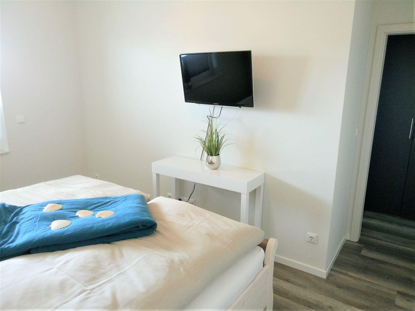 Das eine Schlafzimmer ist mit einem Doppelbett eingerichtet, ein begehbarer Kleiderschrank, mit viel Platz für Ihre Reisegarderobe schließt sich an.
