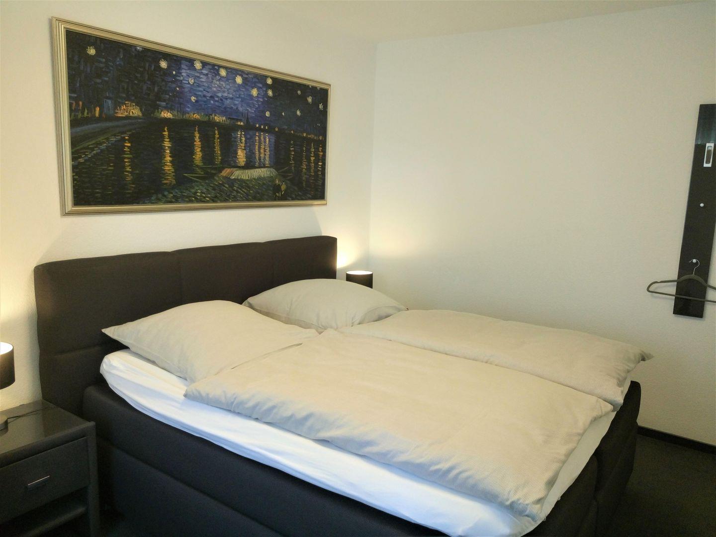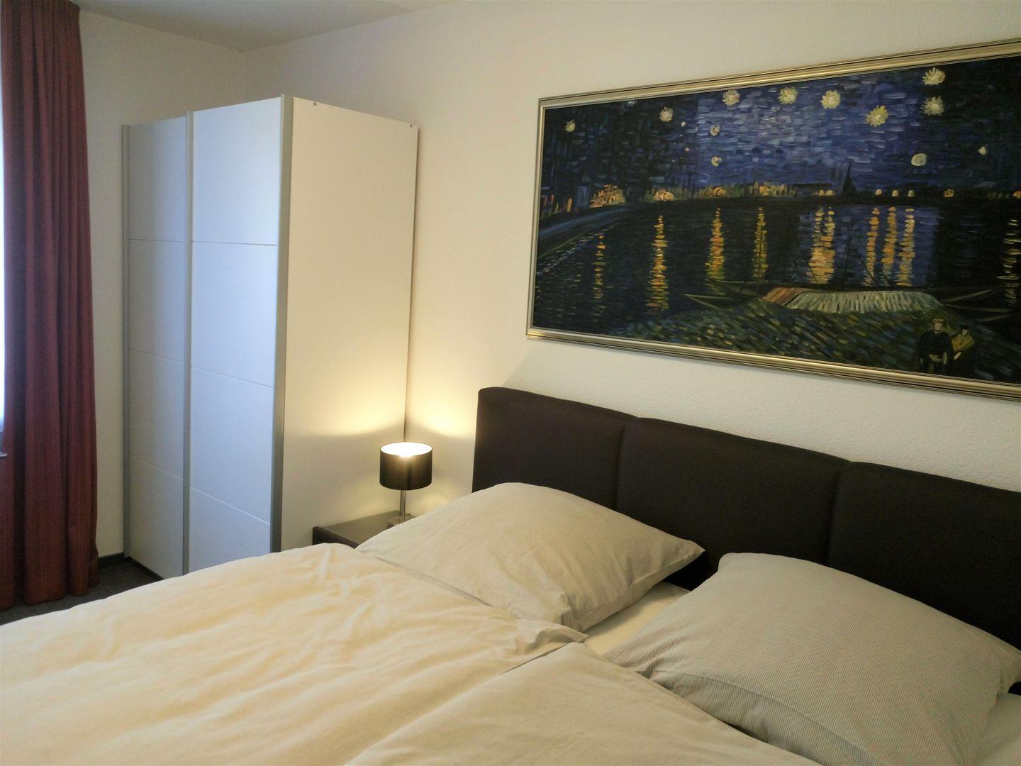 Das Schlafzimmer ist mit einem hochwertigen Boxspring- Doppelbett (durchgehende Matratze) und einem Kleiderschrank eingerichtet. Hier ist auch genügend Platz um ein Baby- Reisebett aufzustellen.