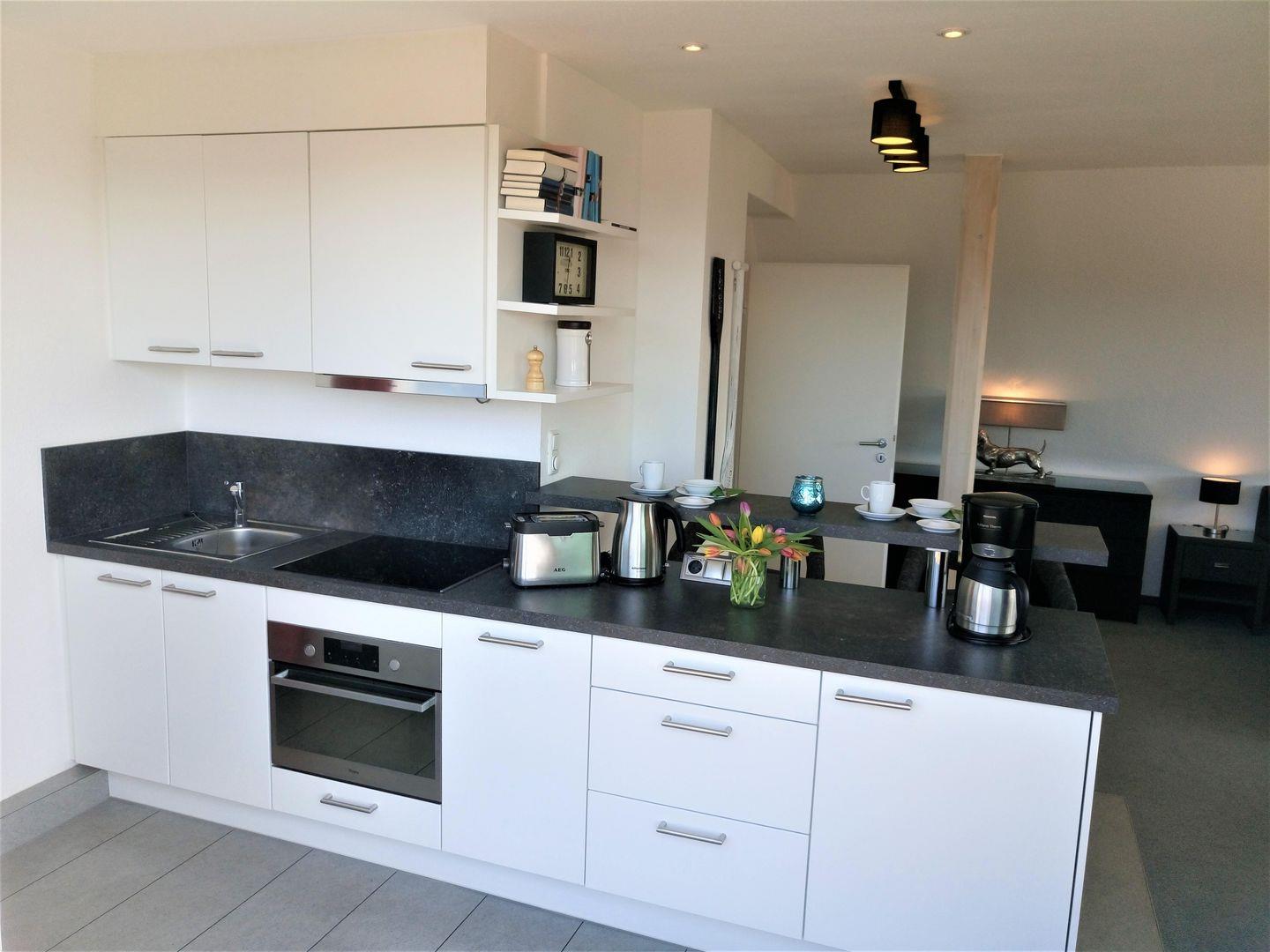 Die Küchenzeile in dem Wohnraum ist gut ausgestattet, mit Geschirrspüler, Backofen, Mikrowelle usw., so dass Sie sich problemlos selber mit Köstlichkeiten von der Küste versorgen können.