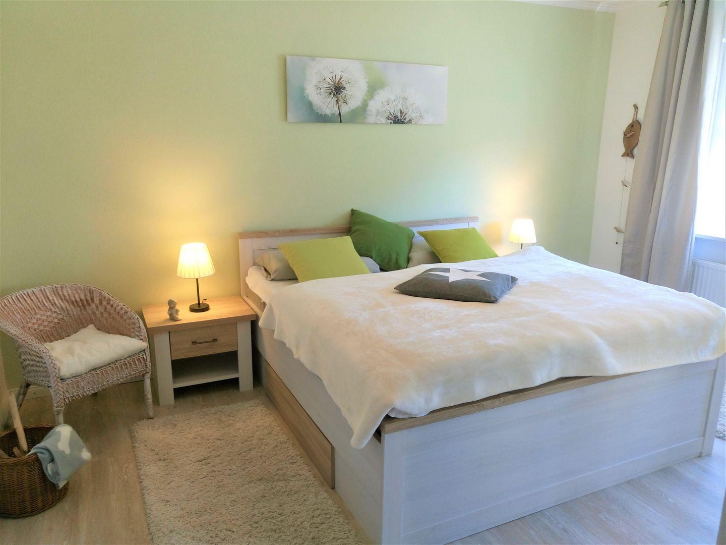 Mit einem Doppelbett (mit 2 Einzelmatratzen), einem Kleiderschrank ist das geräumige, stilvolle Schlafzimmer eingerichtet. Außenjalousien sorgen hier für einen geruhsamen Schlaf.