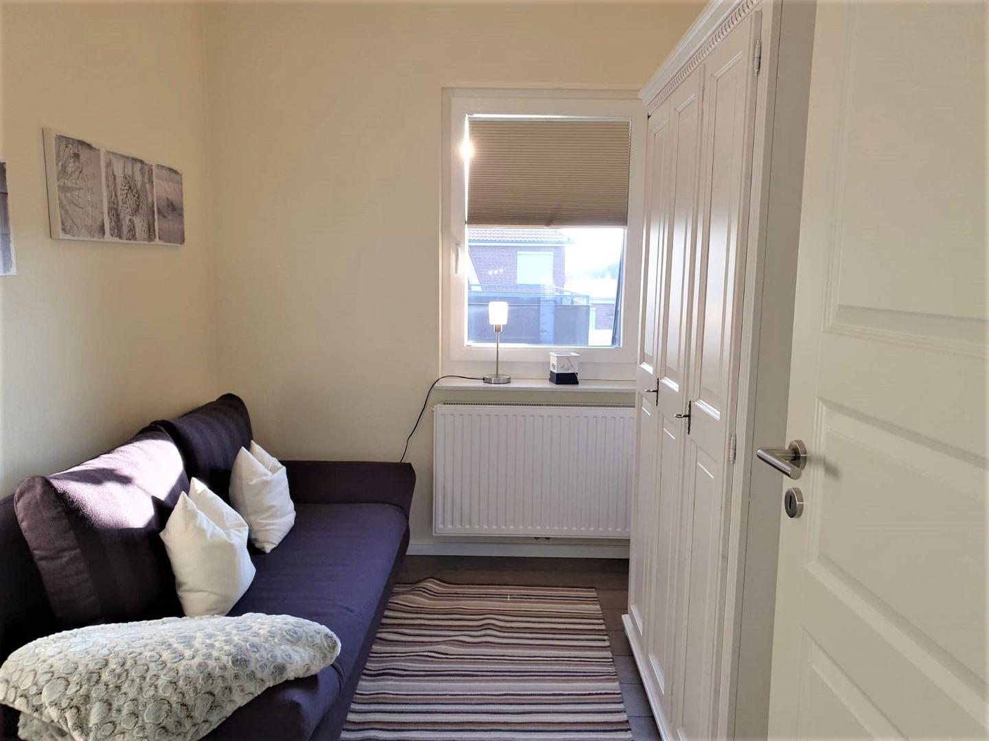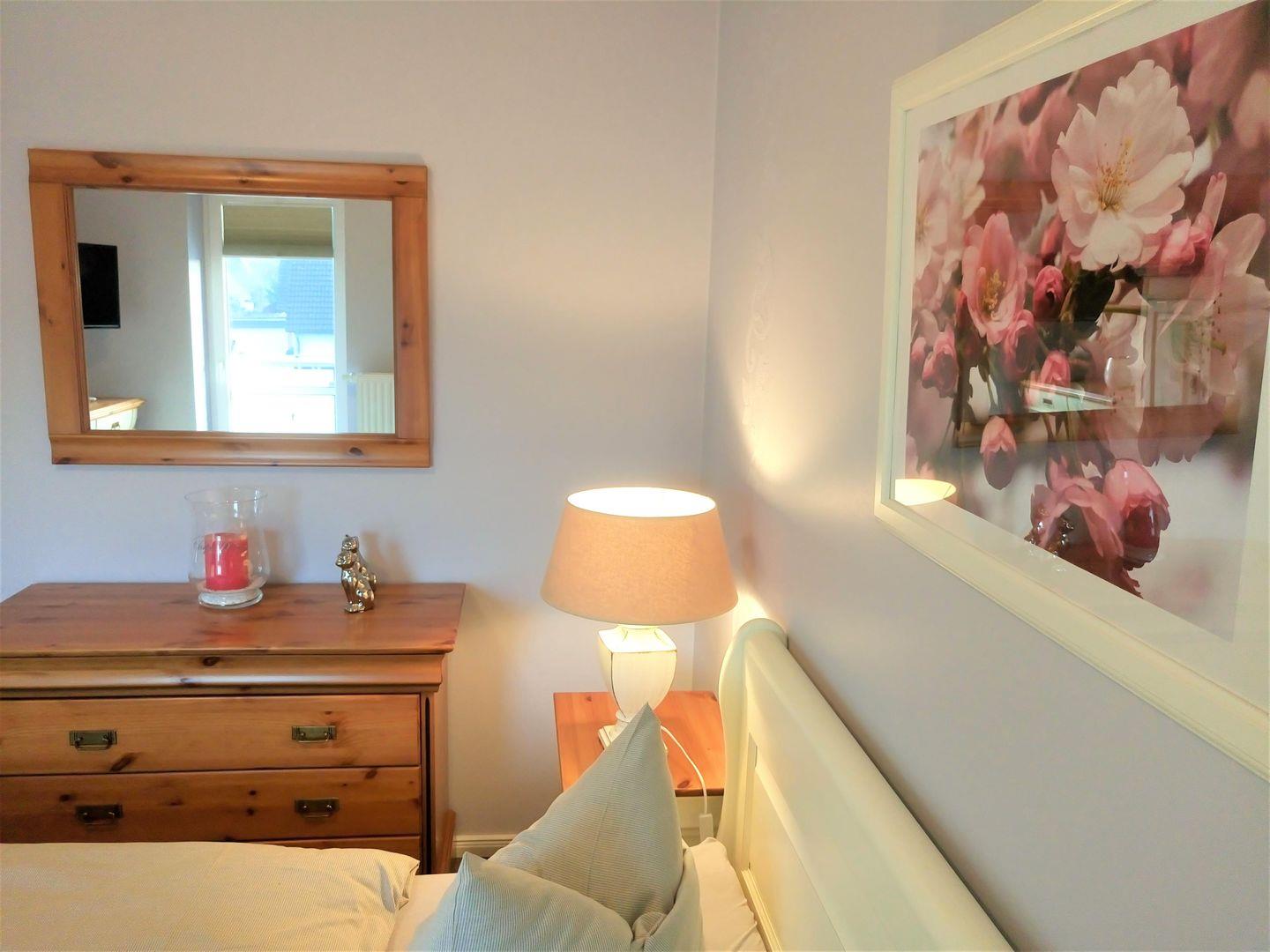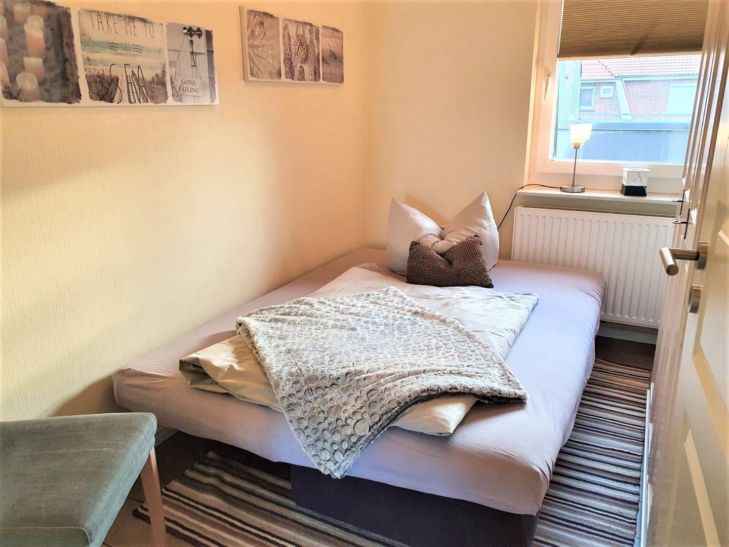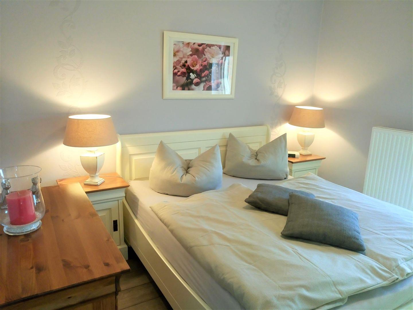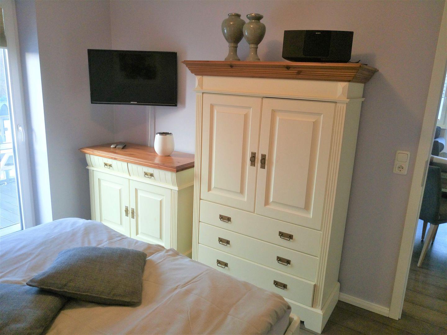 Die Wohnung verfügt über 2 Schlafzimmer. Das eine ist mit einem Doppelbett (1,60x 2m, durchgehende Matratze), hübschen Kommoden und einem TV- Gerät eingerichtet, auch kann man von hier aus den Südbalkon betreten. In dem zweiten Schlafzimmer befindet sich eine Schlafcouch, die ausgezogen werden kann (1,40x 2m), hier steht ein Kleiderschrank für Ihre Garderobe bereit.