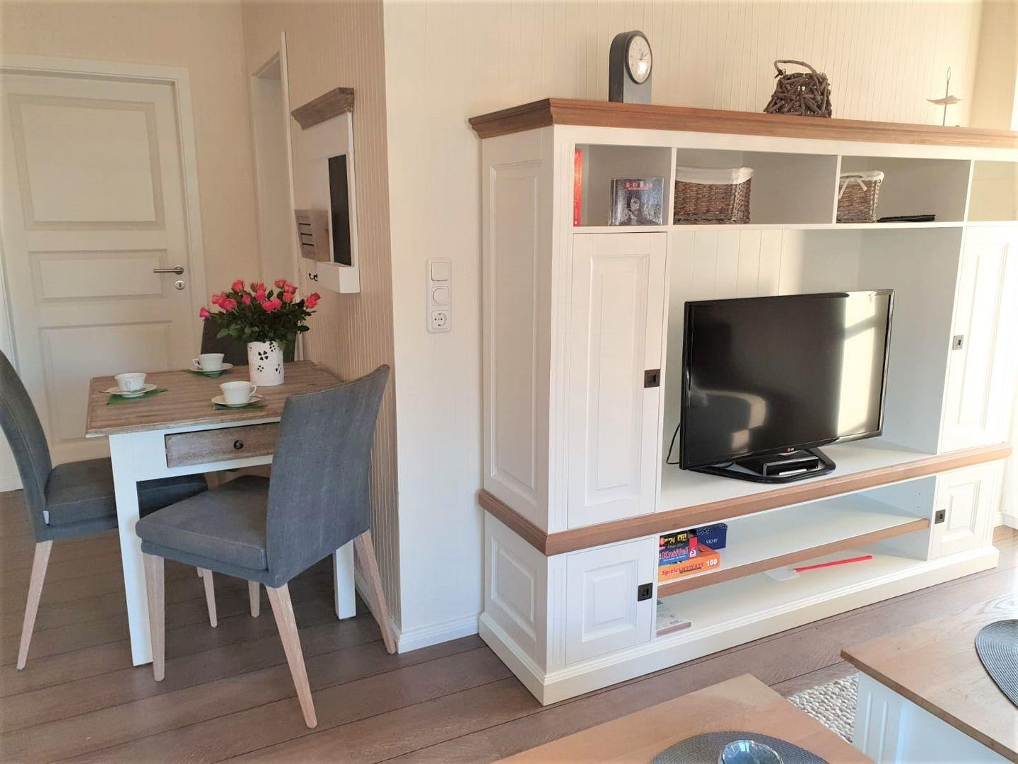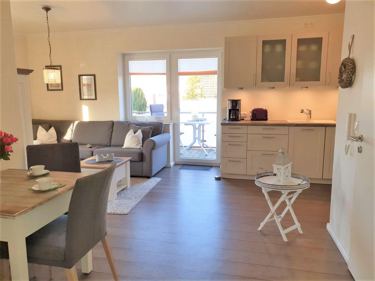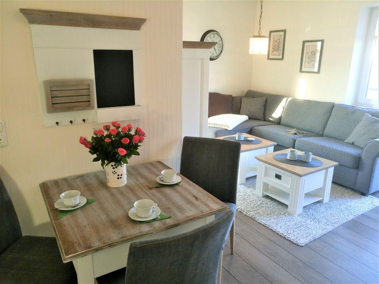 Aber auch in dem schicken und gemütlich eingerichteten Wohn- Essbereich mit der großen Couch kann man herrlich entspannen. Der Wohnbereich verfügt über einen Esstisch, an dem man sich mit Köstlichkeiten aus der Region selber ein bisschen verwöhnen kann. Durch die gut eingerichtete und moderne Küchenzeile, die sich ebenfalls im Wohnbereich befindet, ist das kein Problem.