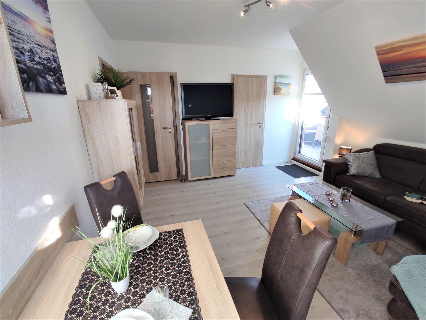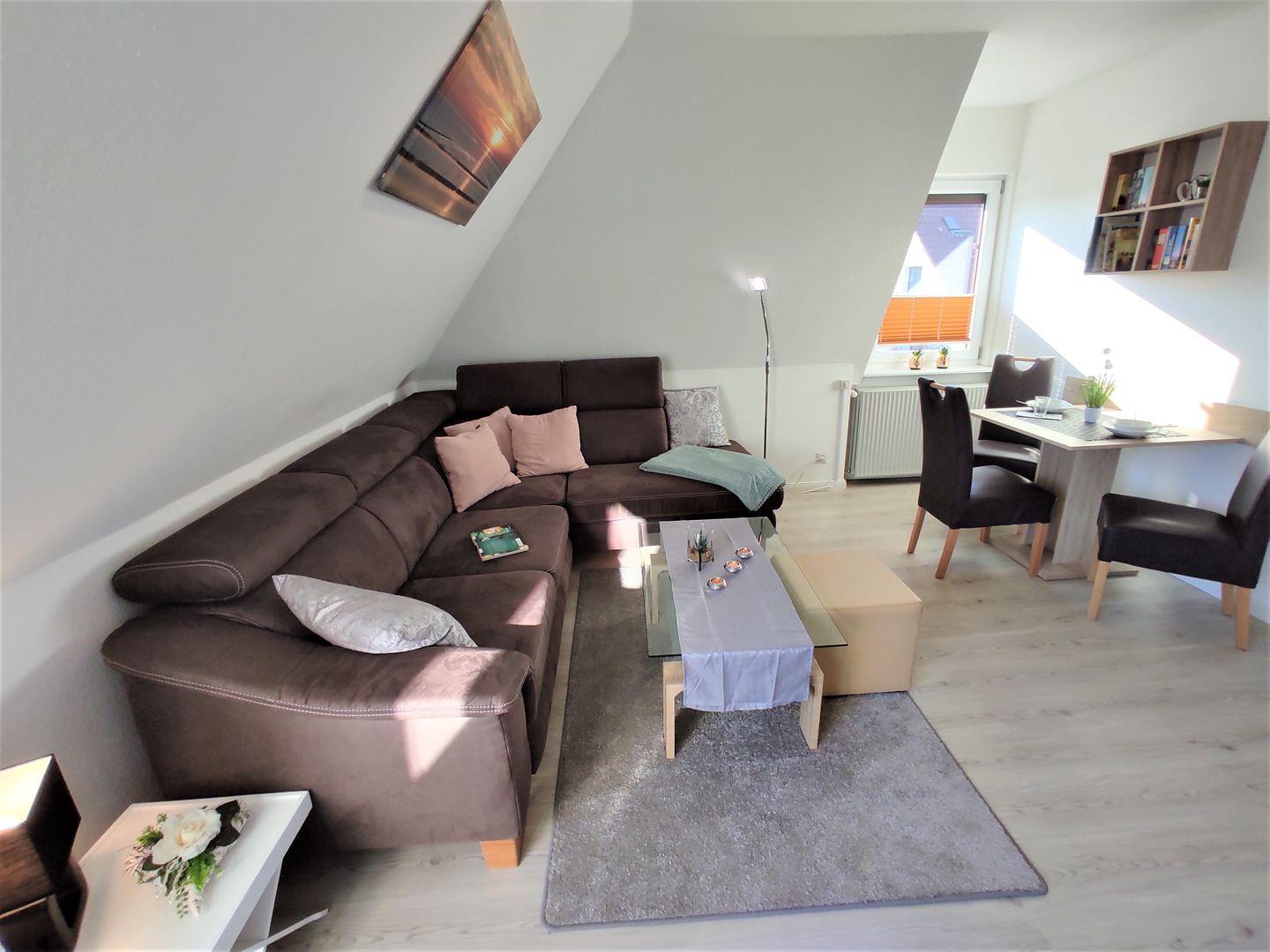 Der gemütliche Wohnraum ist mit einer großen Wohnlandschaft ausgestattet, auf der man es sich richtig bequem machen kann, außerdem ist ein Esstisch vorhanden.