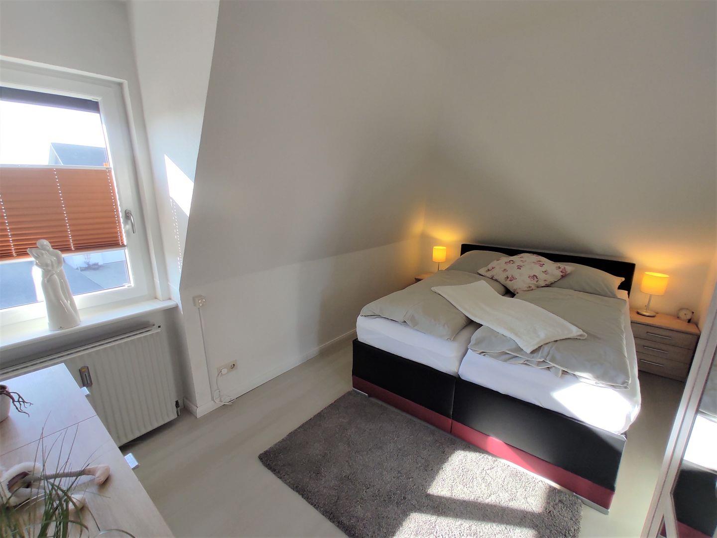 Das geräumige Schlafzimmer ist mit einem hochwertigen Doppelbett ( 2 Einzelmatratzen) und einem Kleiderschrank eingerichtet. Der Raum kann für einen guten Schlaf mit einem Veluxrollo verdunkelt werden.