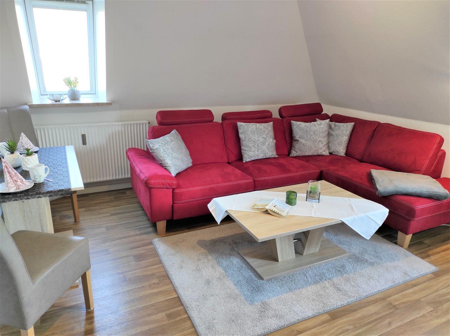 Der gemütlich Wohnraum ist mit einer großen Wohnlandschaft ausgestattet, auf der man es sich richtig bequem machen kann, außerdem ist ein Esstisch vorhanden.