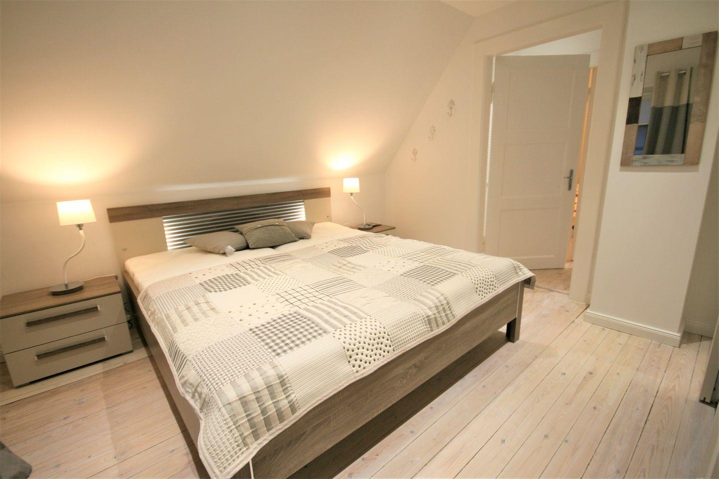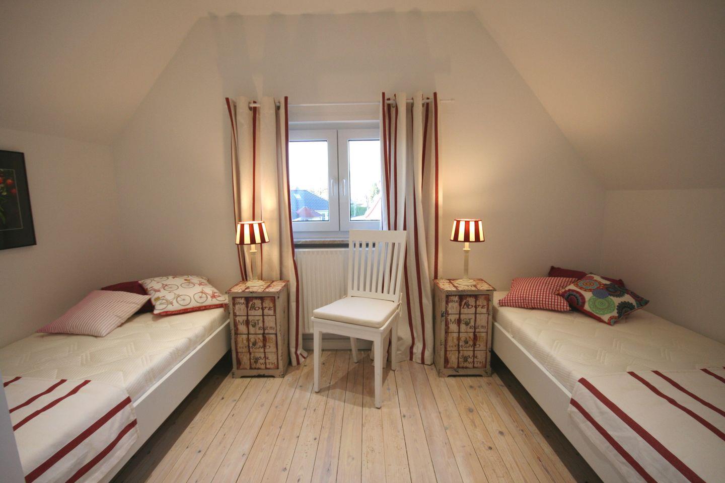 Im Obergeschoss liegen 2 Schlafzimmer, das eine ist mit einem Doppelbett, einem Kleiderschrank und einem TV- Gerät eingerichtet und verfügt über ein zusätzliches kleines Bad-en-Suite mit Dusche. Das 2te Schlafzimmer ist mit 2 Einzelbetten und einem Kleiderschrank möbliert.