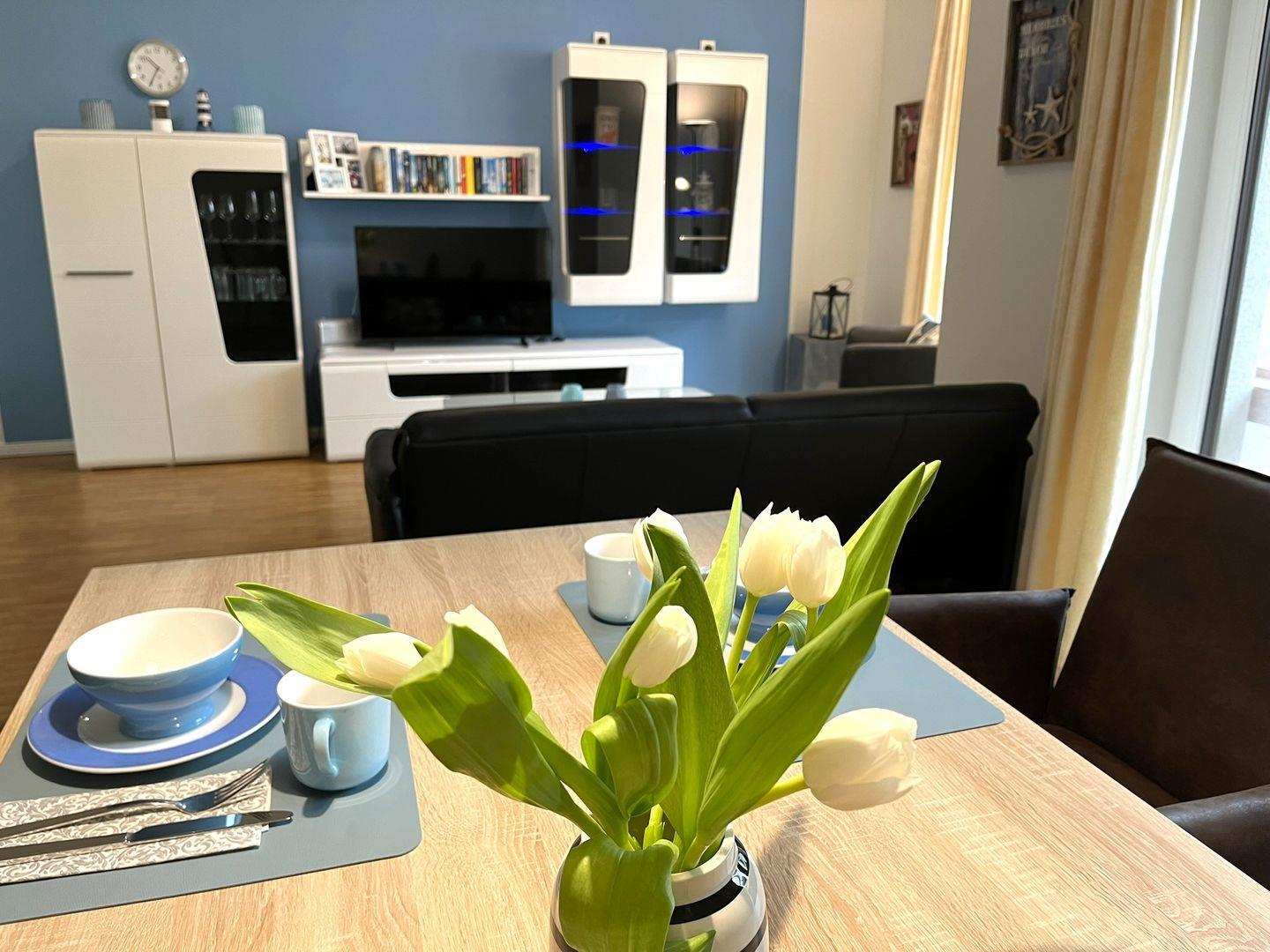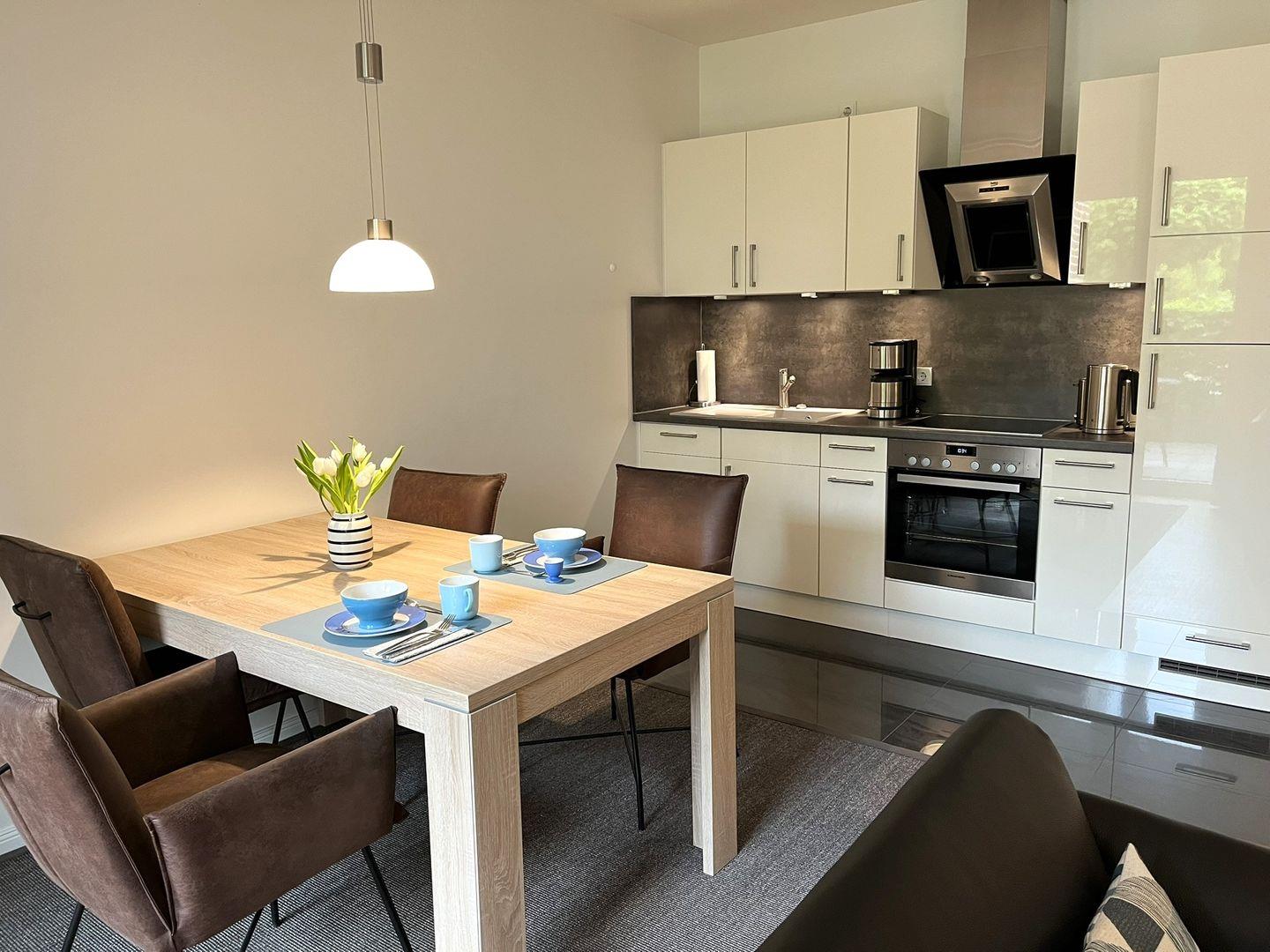 Von der Terrasse mit Morgensonne betritt man den schönen, modernen Wohn- Essbereich, der, wie die ganze Ferienwohnung, mit Parkett ausgelegt ist und durch eine Fußbodenheizung erwärmt wird.