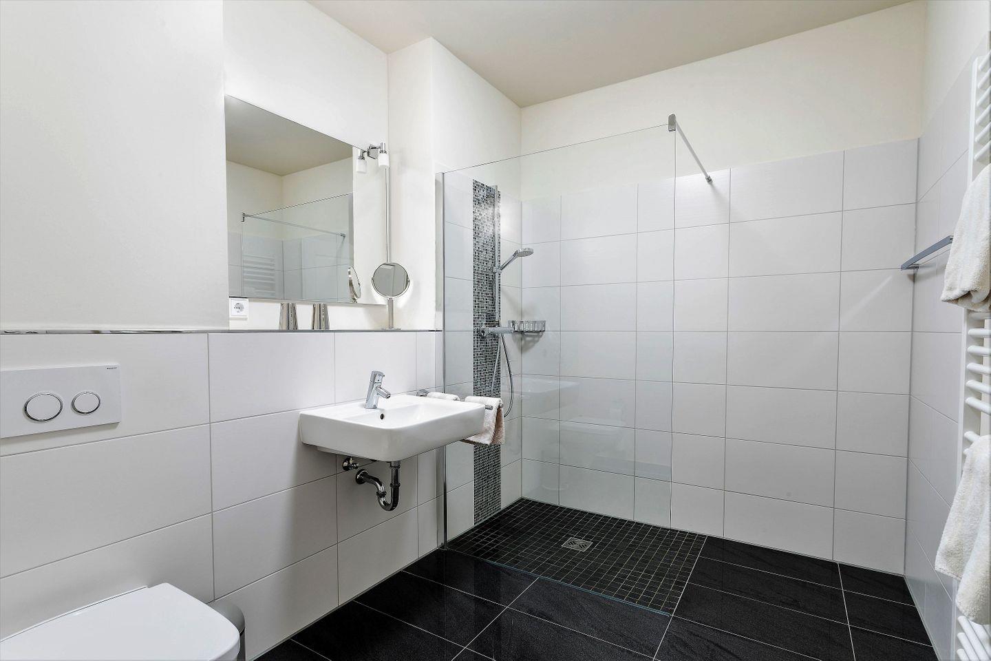 Das elegante Badezimmer mit Handtuchwärmer und bodengleicher Dusche macht diese Ferienwohnung perfekt.