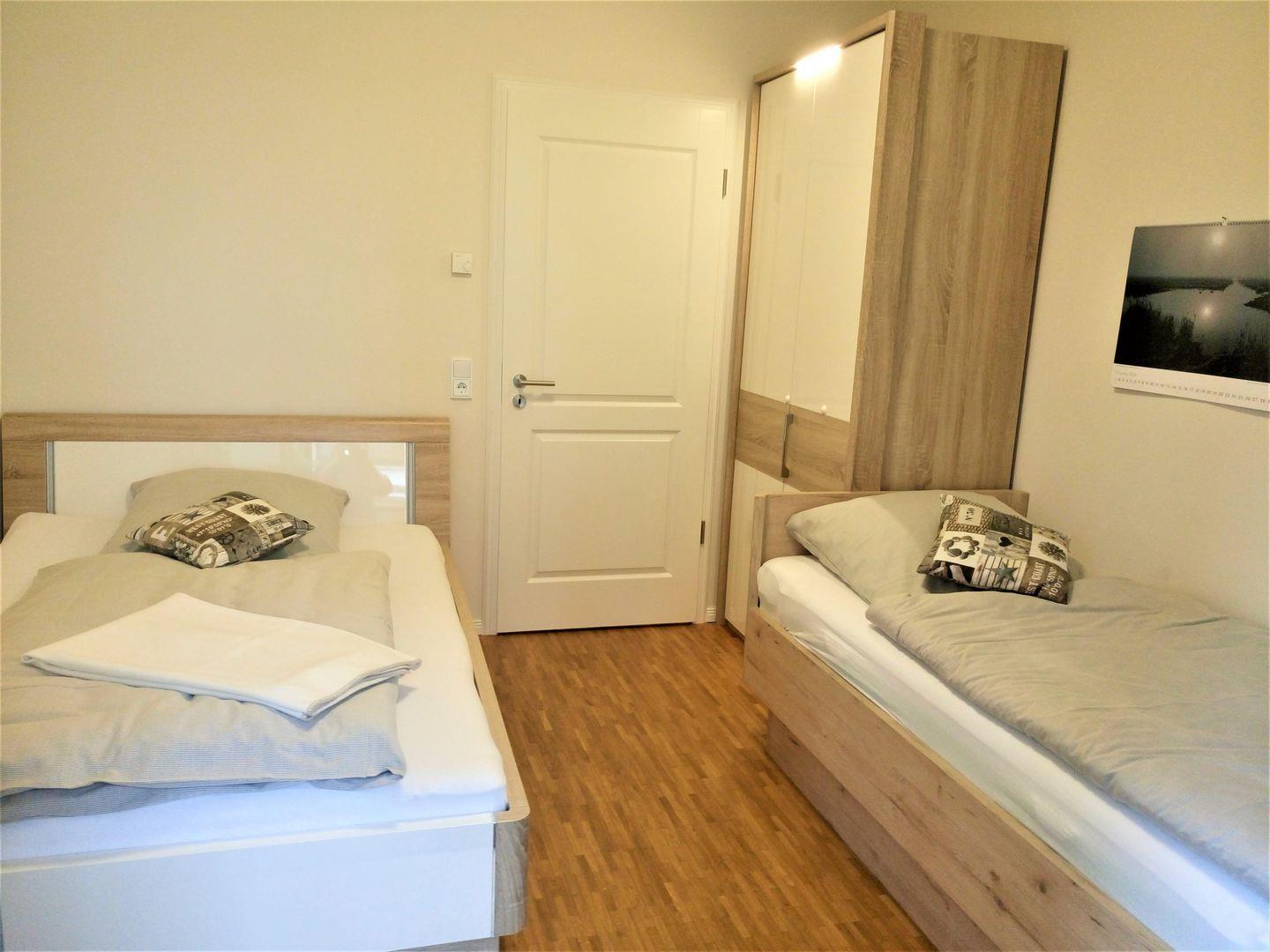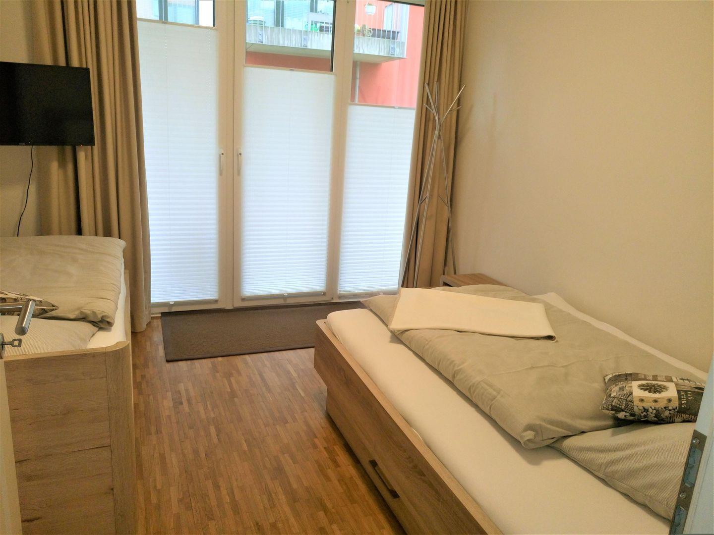 Vor dem großzügigen Schlafzimmer, mit TV und Doppelbett ( 2 Einzelmatratzen), gibt es eine weitere Terrasse, mit Blick auf den Innenhof und Sonne am Nachmittag. Dieses gilt ebenso für das 2te Schlafzimmer mit 2 Betten, das eine 1,40x 2m, das andere 0,90x 2m.