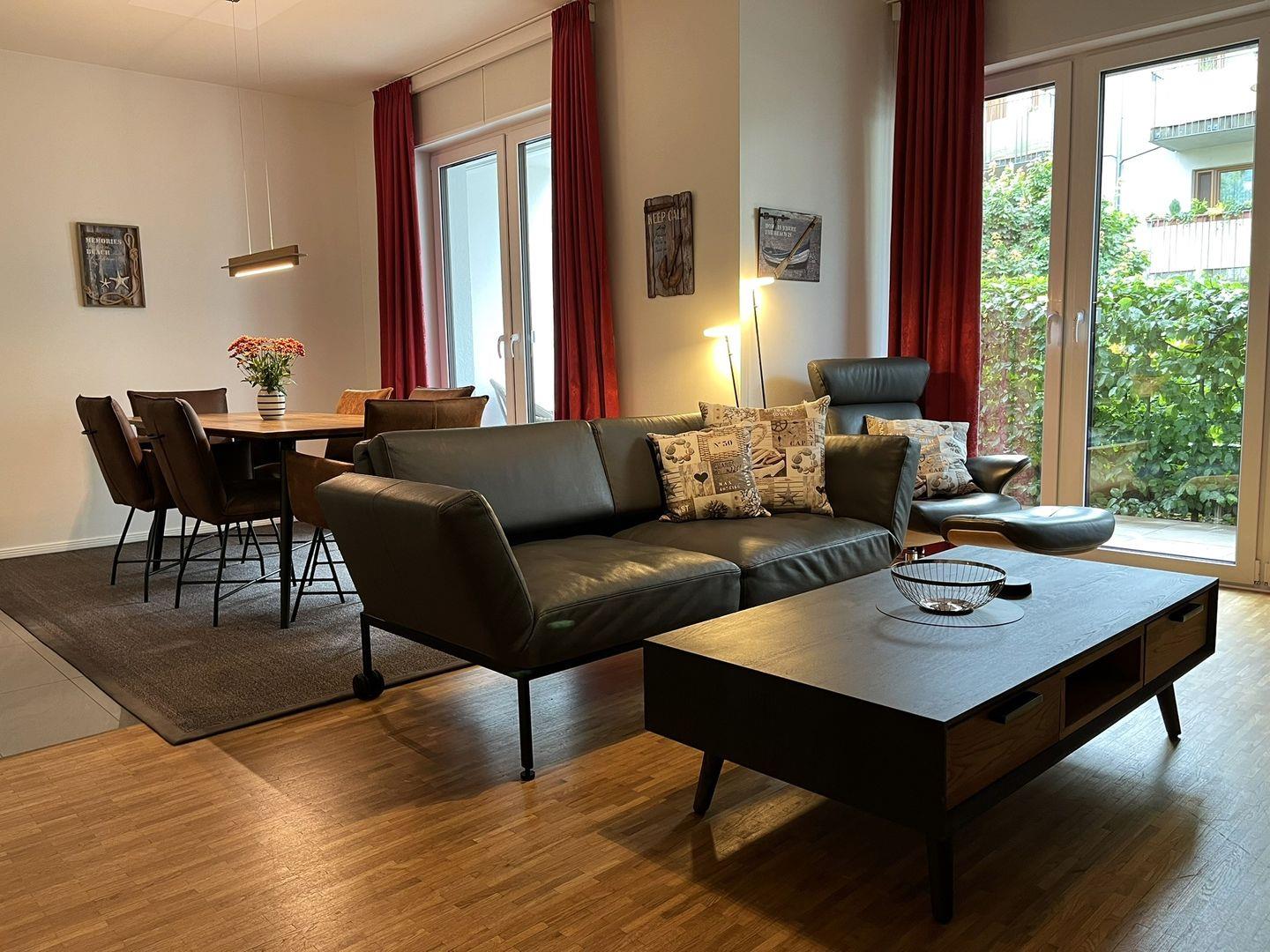 Von der Terrasse mit Morgensonne betritt man den schönen, modernen Wohn- Essbereich, der, wie die ganze Ferienwohnung, mit Parkett ausgelegt ist und durch eine Fußbodenheizung erwärmt wird.