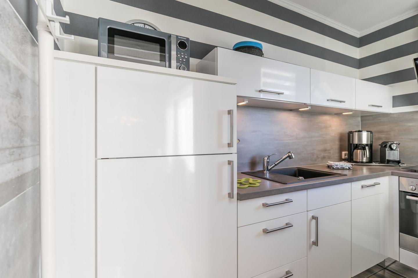Kühl- und Gefrierkombination, Backofen mit Ceranherd, Dunstabzug, Kaffeemaschine, zusätzliche Nespresso Kapselmaschine, Geschirrspüler, Mikrowelle