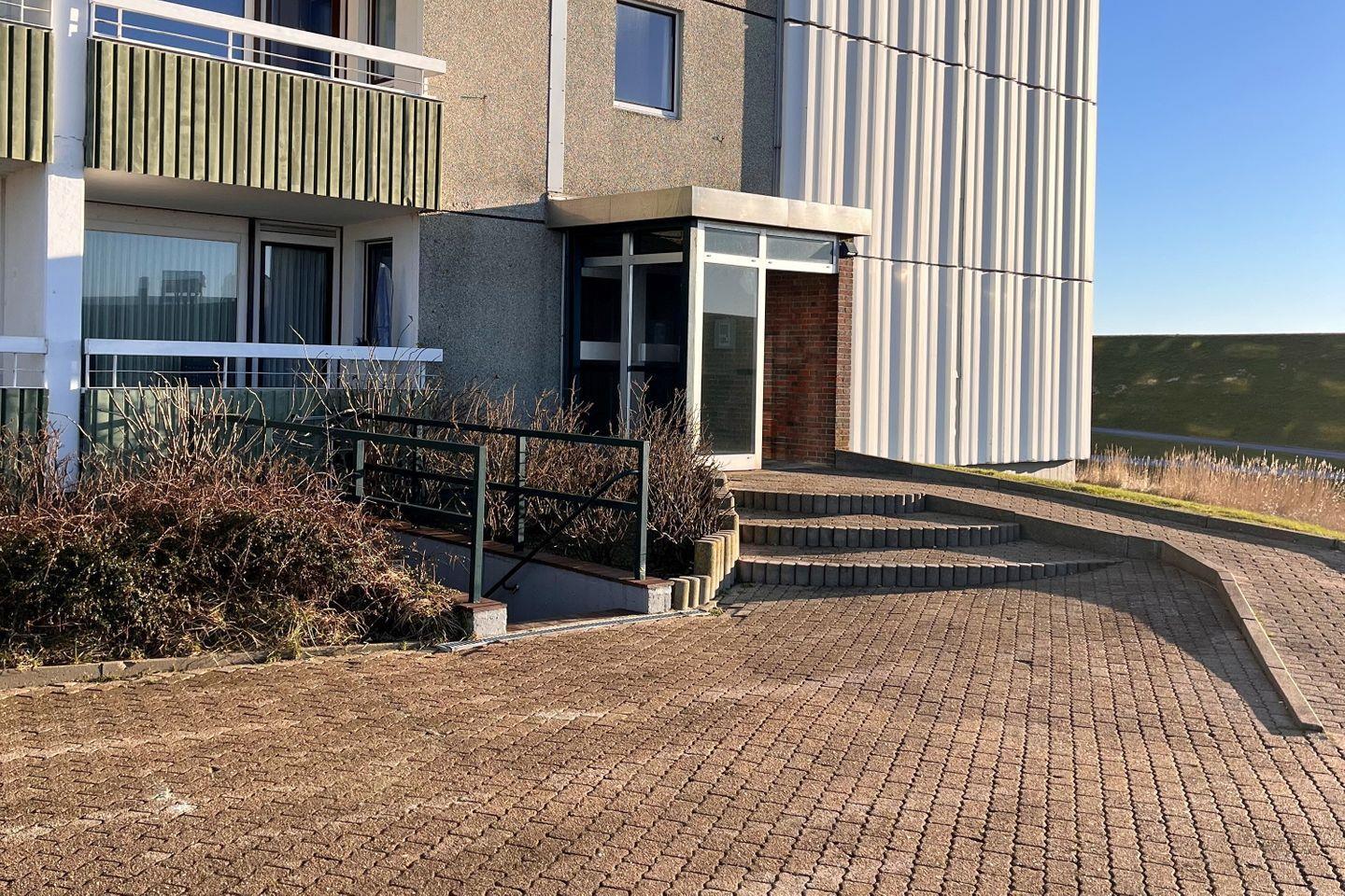 Urlaub pur vom ersten Augenblick. Über ein paar Treppenstufen sowie über einem stufenlosen Nebeneingang sind die Eingänge zum Hochhaus erreichbar.