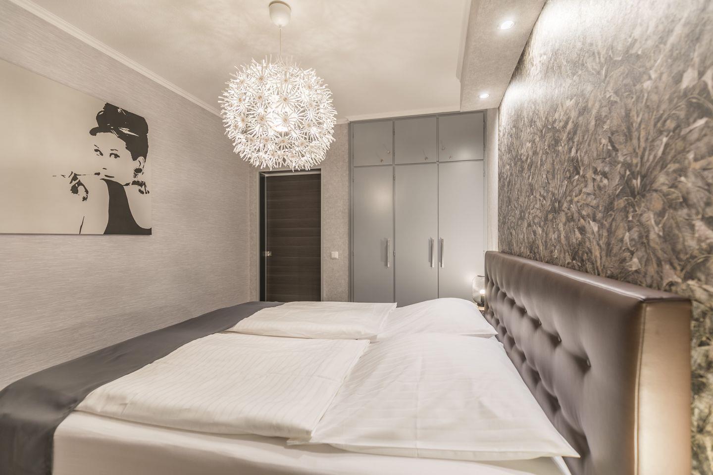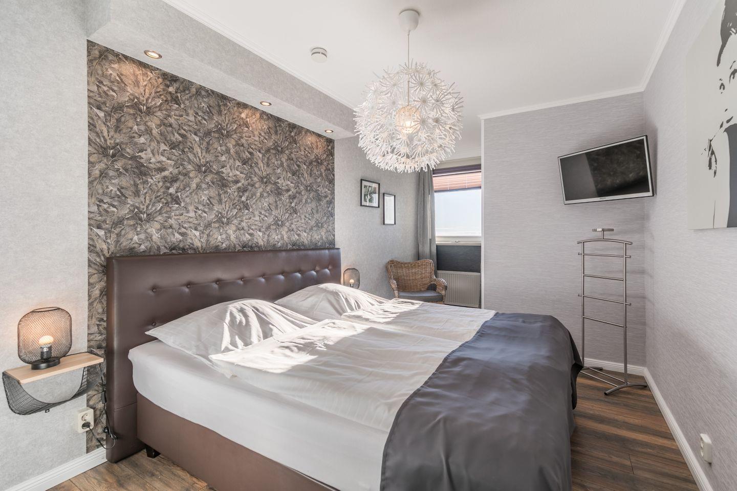 Boxspringbett (180 x 200 mit 2 Einzelmatratzen), Nachtkonsolen mit Beleuchtung, Flat TV, Sessel, Einbauschrank