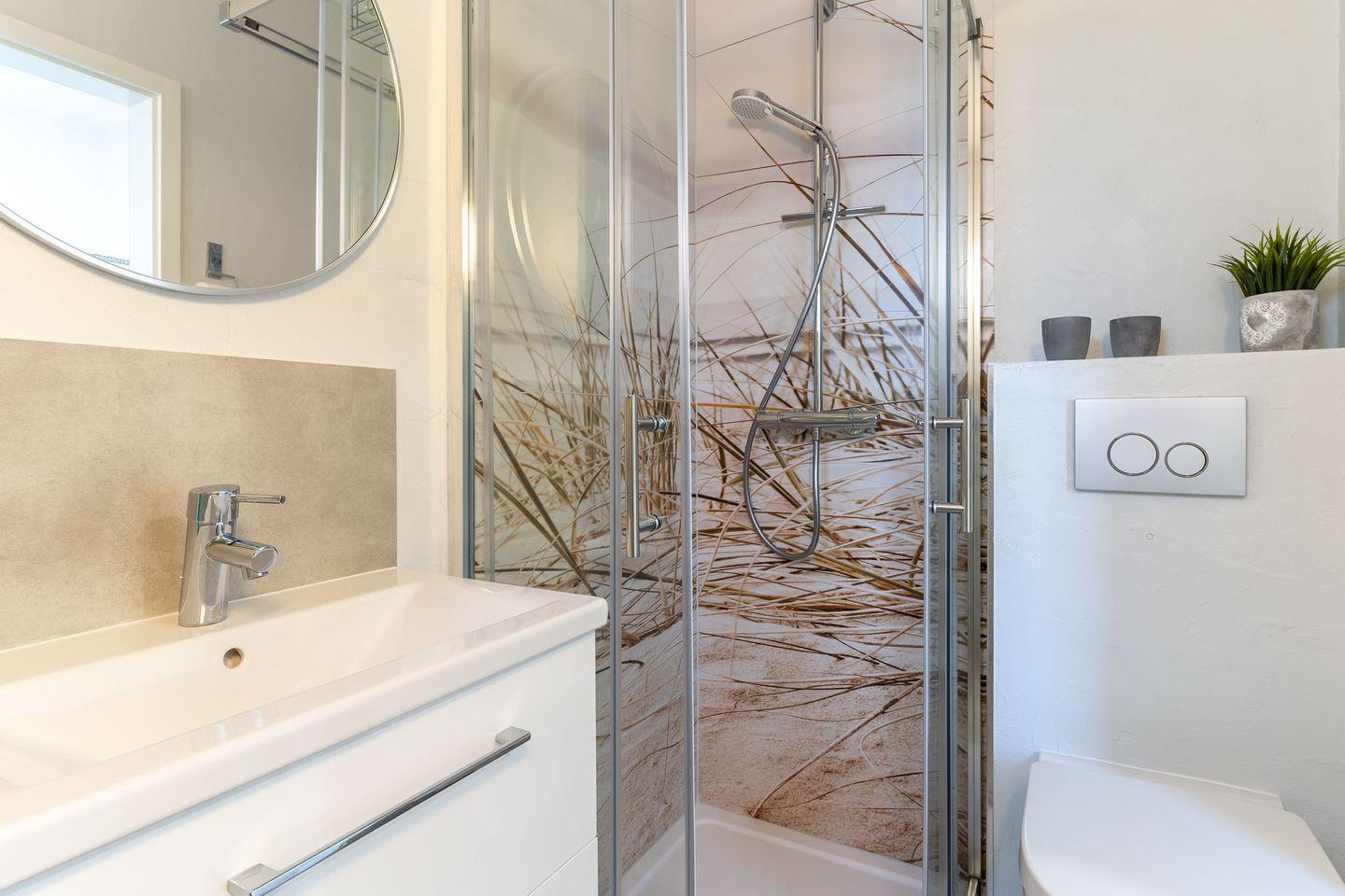 Im Erdgeschoss erwartet Sie eine großzügige Wohnküche mit moderner Ausstattung, die zum gemeinsamen Kochen und Essen einlädt. Der Zugang zur teilweise überdachten Süd-Terrasse schafft ein angenehmes Ambiente zum Entspannen. Das angrenzende Duschbad sorgt für erfrischende Momente an warmen Tagen.