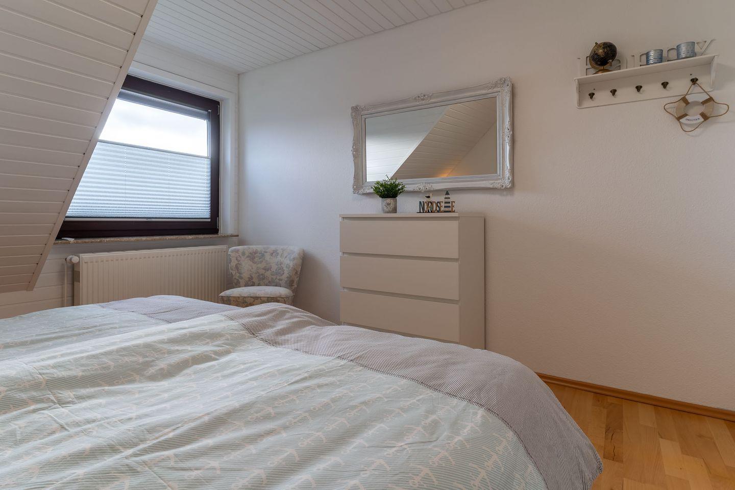 Über eine charmante Steintreppe gelangen Sie ins erste Obergeschoss, wo sich zwei gemütliche Schlafzimmer und ein Gäste-WC befinden. Im ersten Schlafzimmer erwartet Sie ein komfortables Doppelbett (1,80 x 2,00m) für einen erholsamen Schlaf. Im zweiten Schlafzimmer finden Sie ebenfalls ein gemütliches Doppelbett (1,60 x 2,00m), das für angenehme Nächte sorgt.