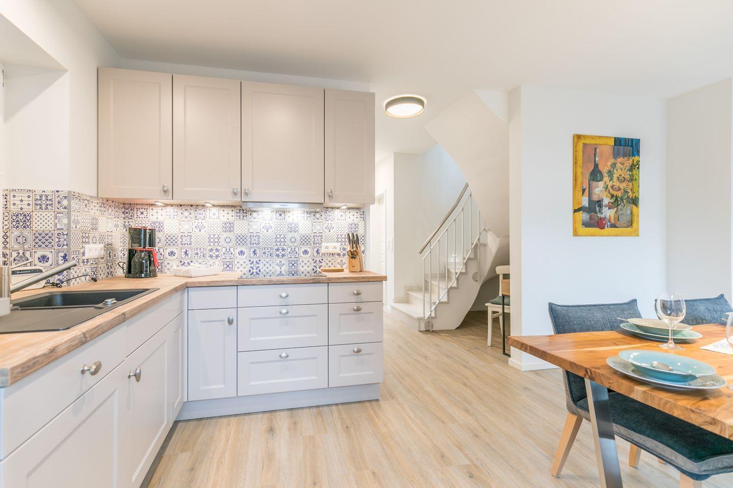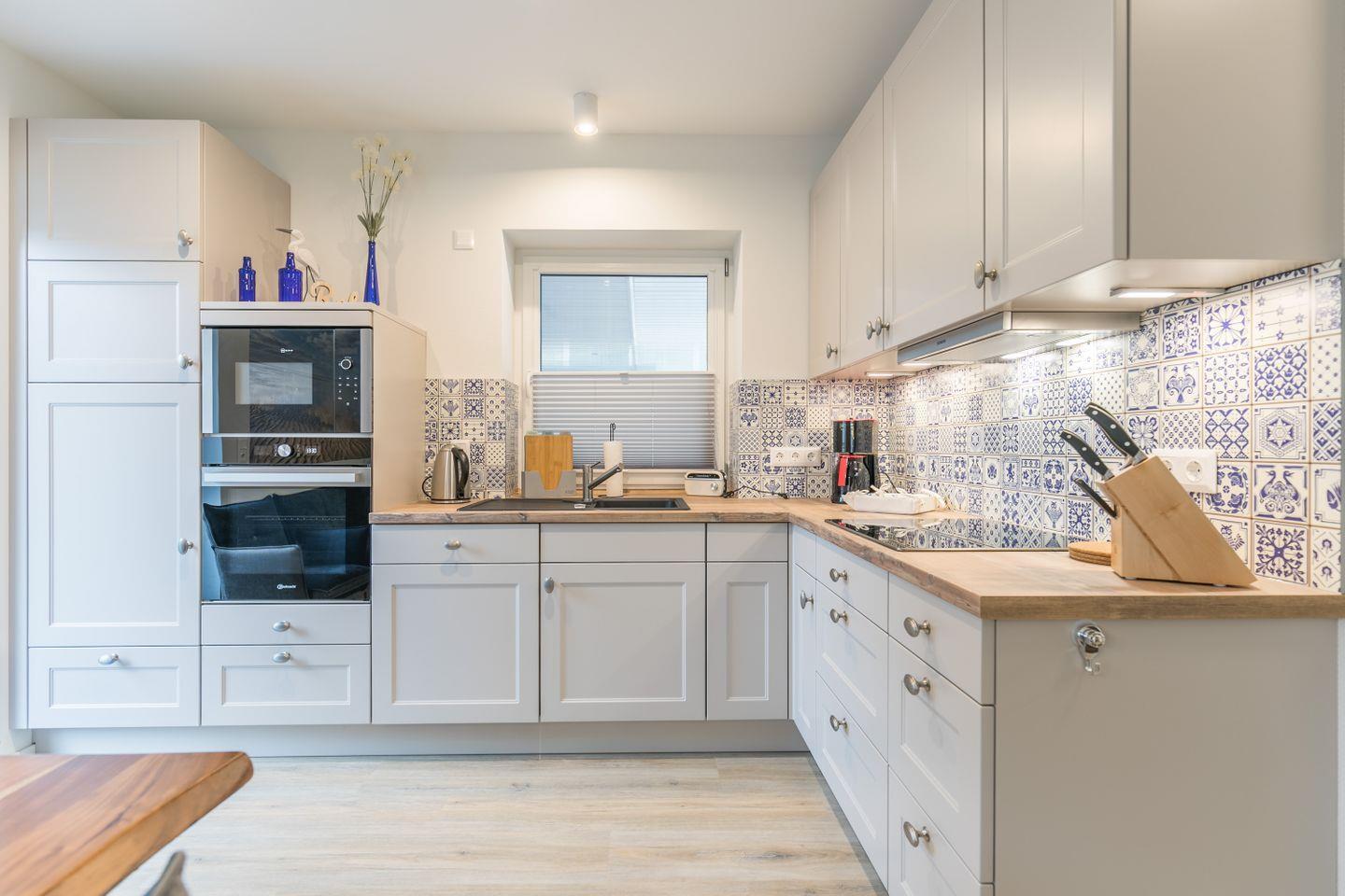 Küchenzeile mit Herd, Backofen, Kühlschrank mit Doppelgefrierfach, Geschirrspüler, Kaffeemaschine, Mikrowelle, Wasserkocher, Eierkocher, Toaster, Handrührgerät