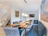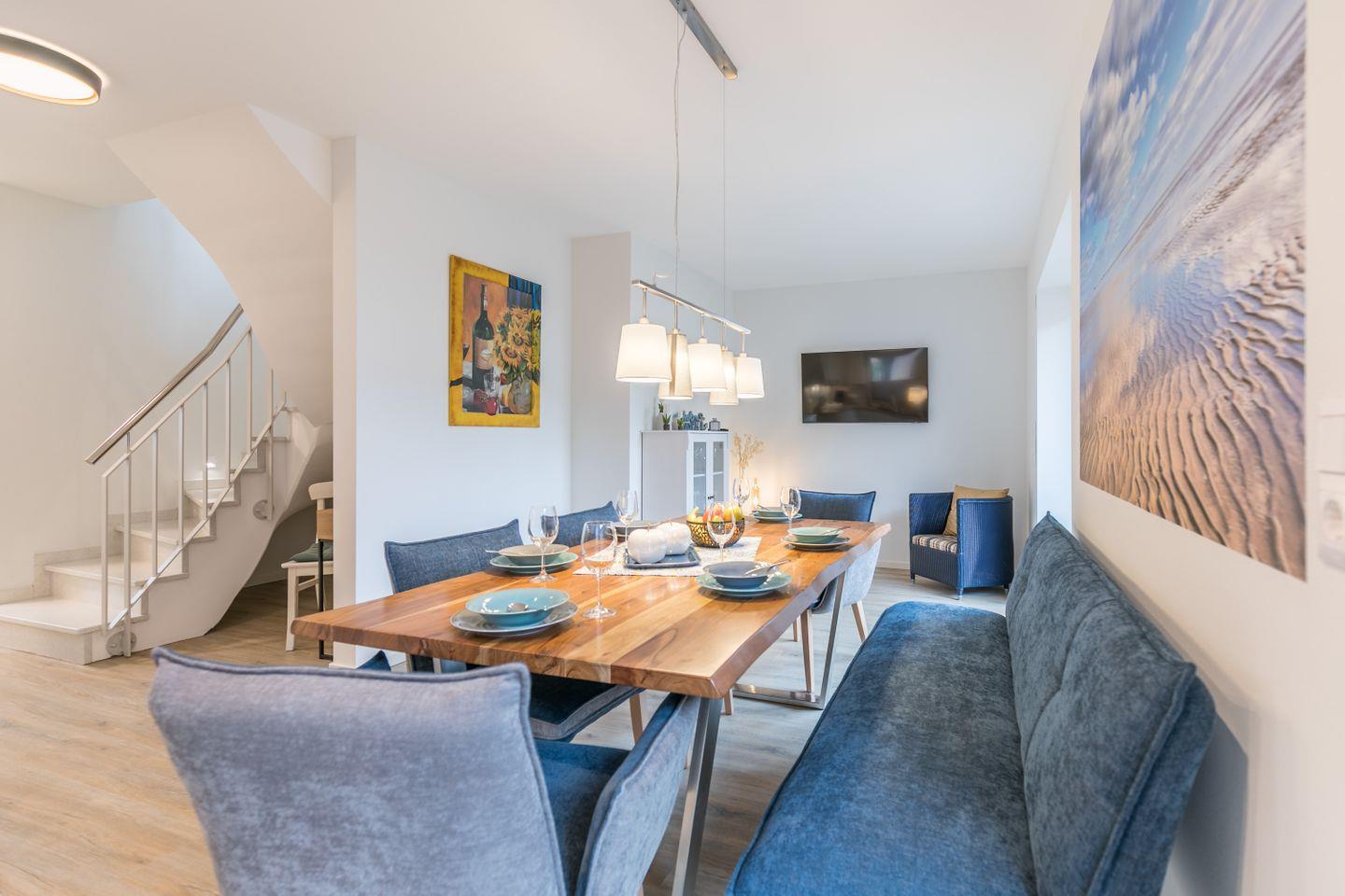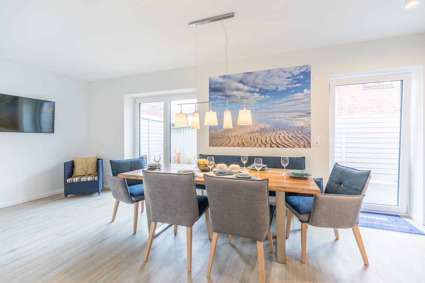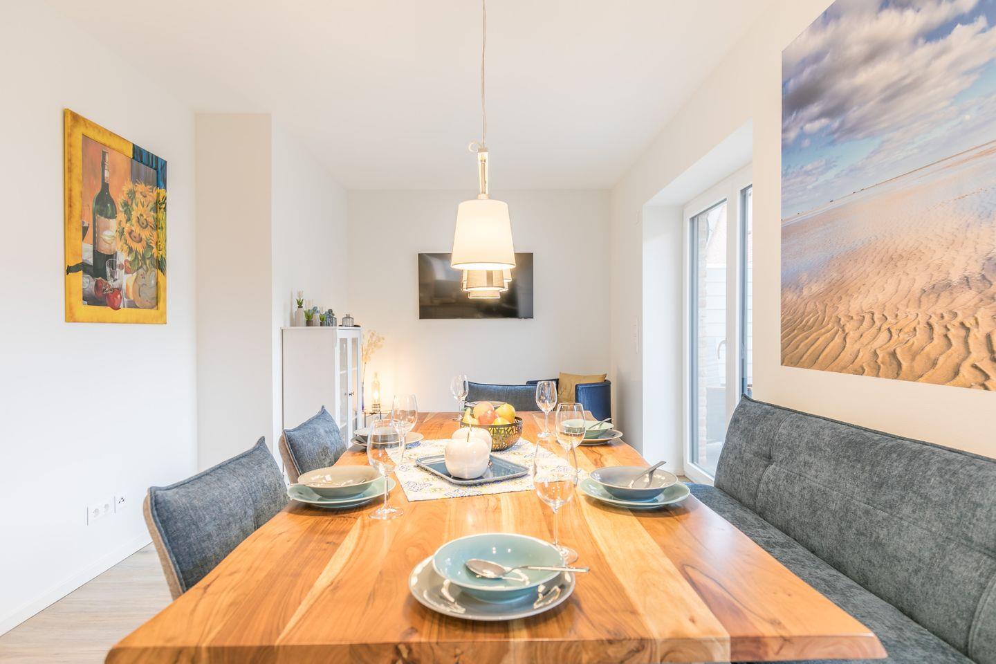 großer Esstisch mit Sitzbank und Esszimmersesseln, Flachbild-TV, Vitrine, Sessel, Zugang zur Terrasse, bodentiefe Fenster mit elektrischen Außenrollos, Radio