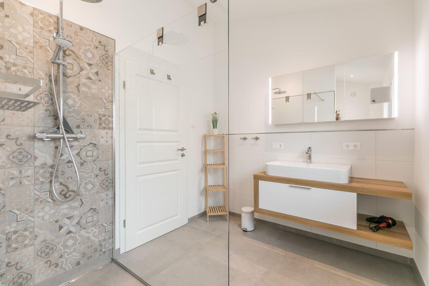Ebenerdige Dusche, WC, Waschtisch, Spiegelschrank, Föhn, Regal, Fenster mit Plissee