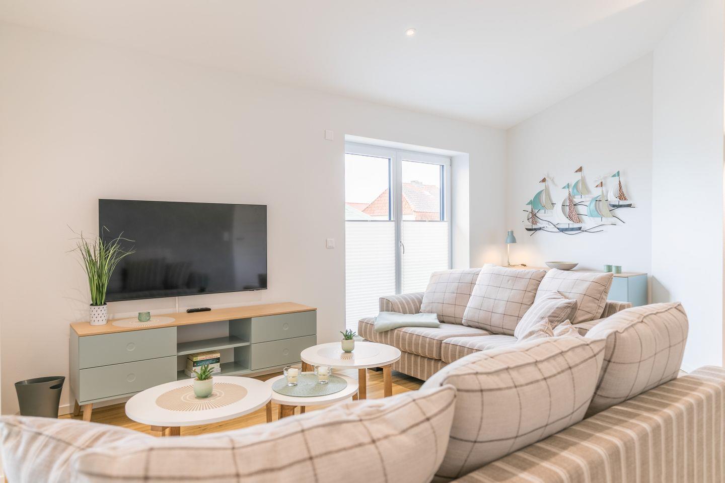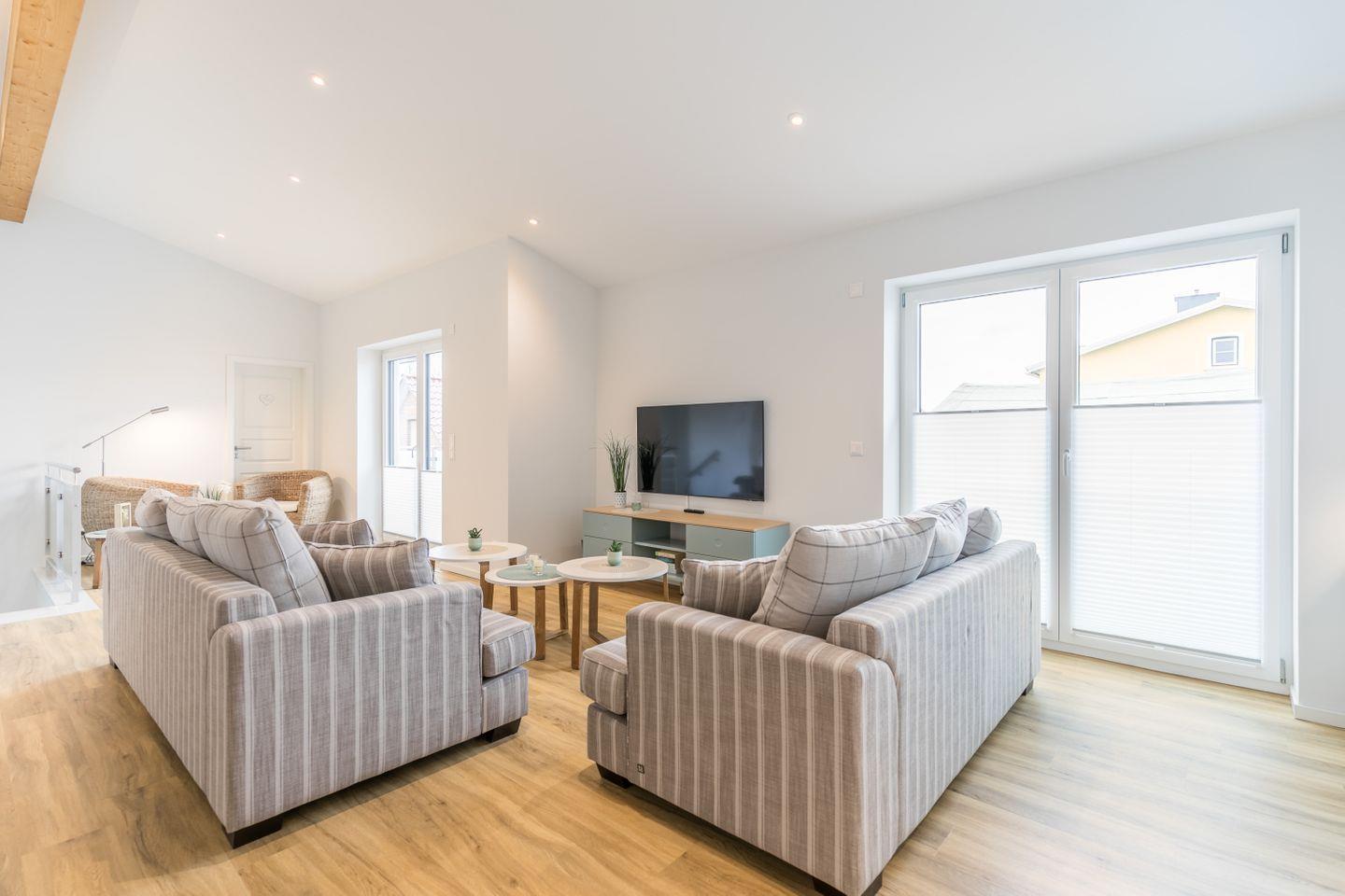 2 großzügige Sofas, Flachbild-TV, TV-Board, Sitzecke mit 2 Korbstühlen, Kommode, Zugang zum Balkon, bodentiefe Fenster mit Plissee und elektrischen Außenrollos