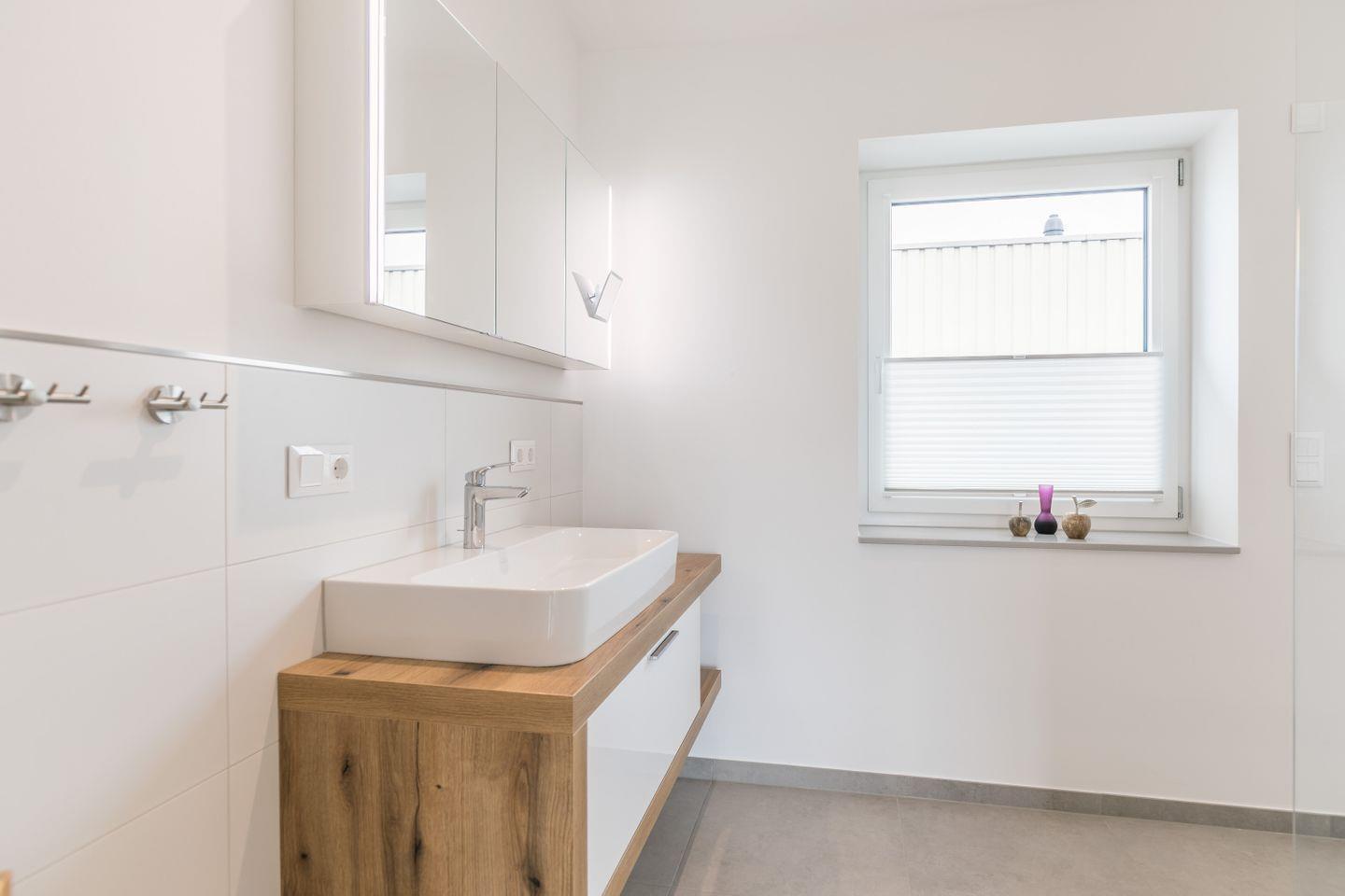WC, Waschbecken, Spiegel, Fenster mit Plissee und elektrischen Außenrollo