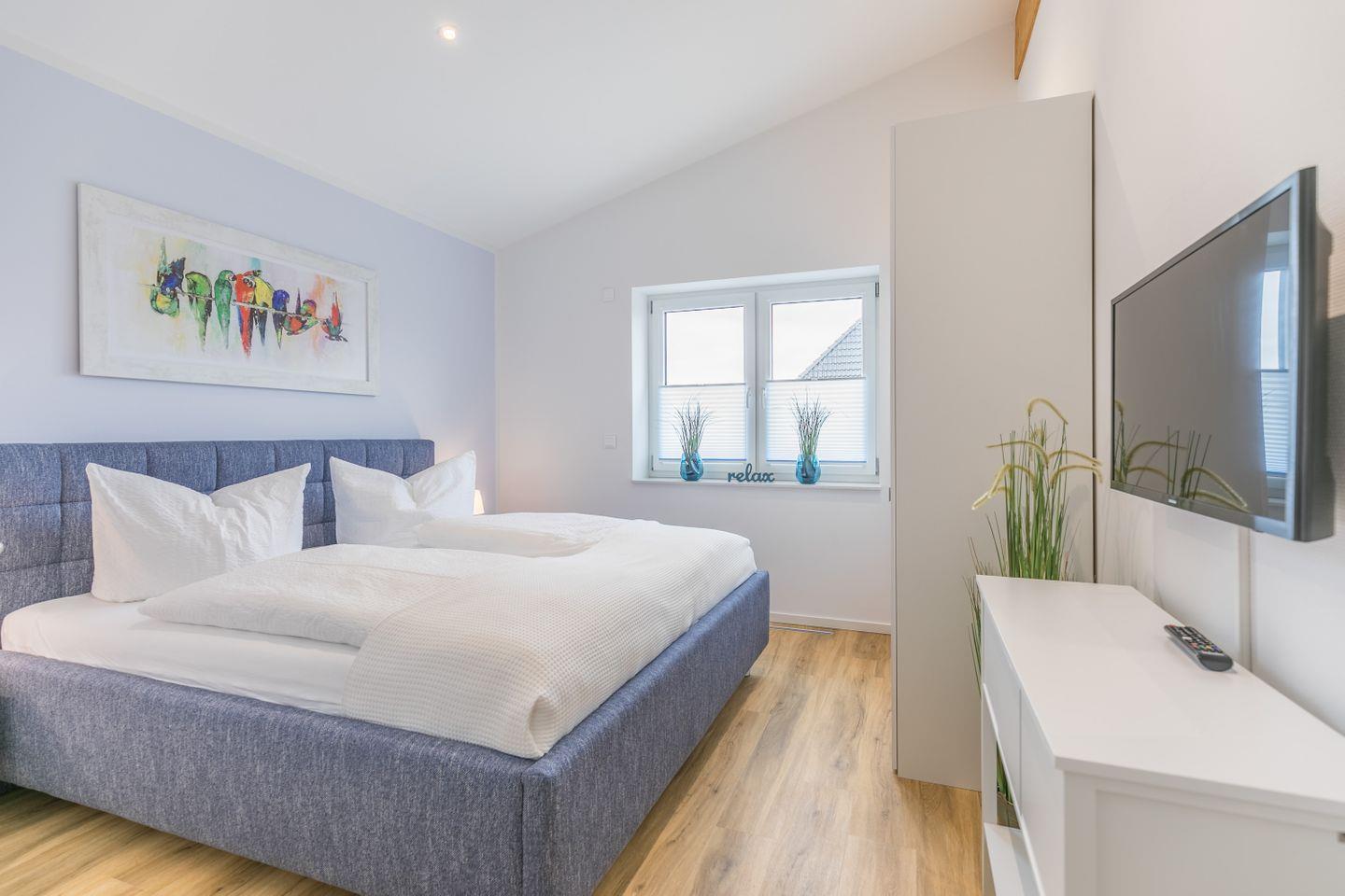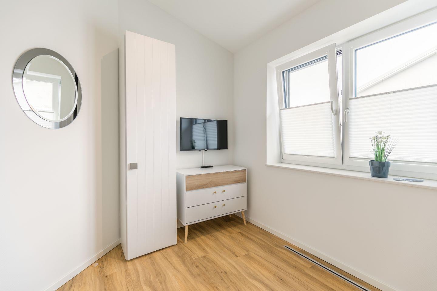 Bett 200 x 140 x 60 cm (durchgehende Matratze), Kleiderschrank, Ganzkörperspiegel, Kommode, Flachbild-TV, Fenster mit Plissee und elektrischen Außenrollos