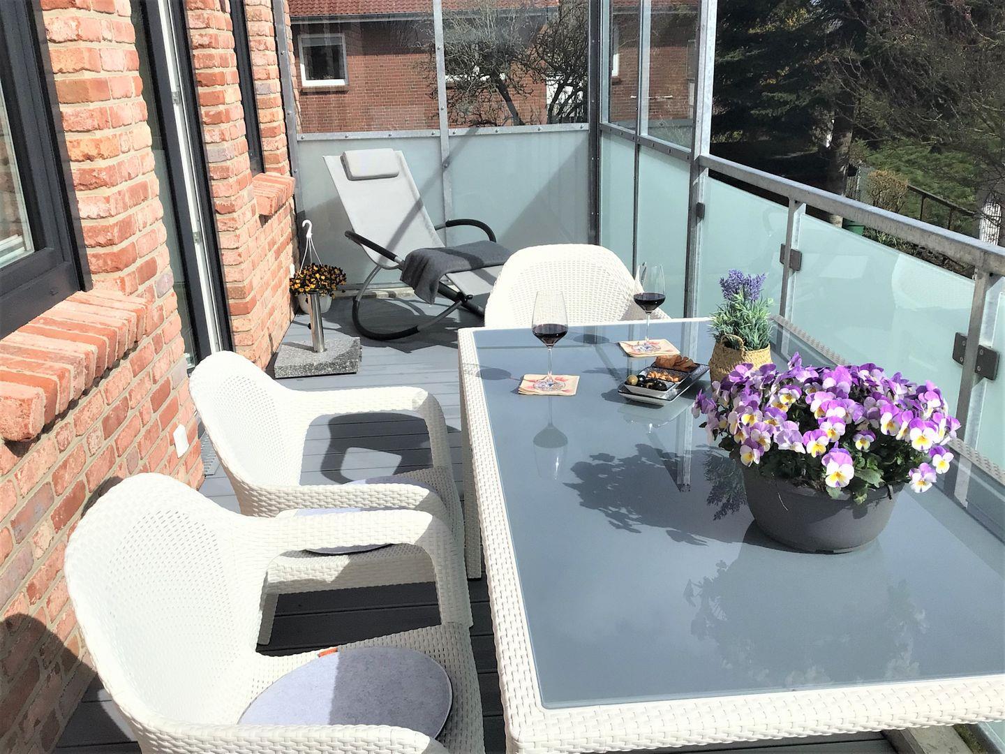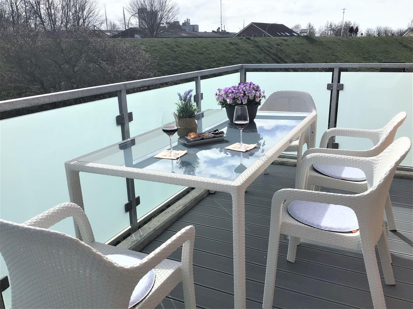 Ein Highlight dieser Wohnung ist mit Sicherheit der große, möblierte Sonnenbalkon, mit Blick auf den Alten Büsumer Deich.