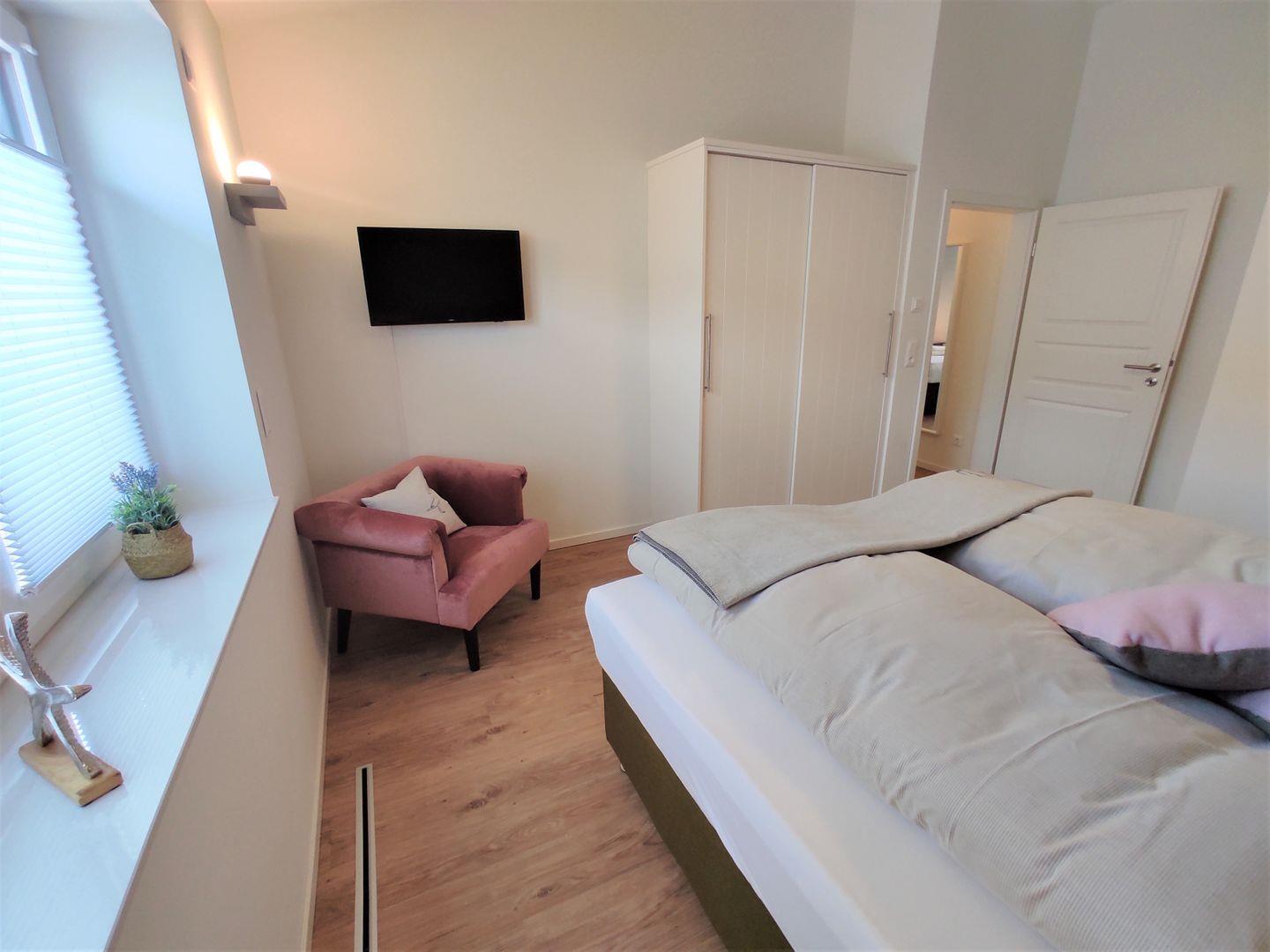 In dem einen Schlafzimmern gibt es 1 Boxspring- Doppelbetten (1,80x 2m, mit durchgehender Matratze), in dem 2ten Schlafzimmer finden Sie 2 Einzel- Boxspringbetten (0,90x 2m) vor. Kleiderschränke mit reichlich Platz für Ihre Garderobe stehen in beiden Räumen zur Verfügung.