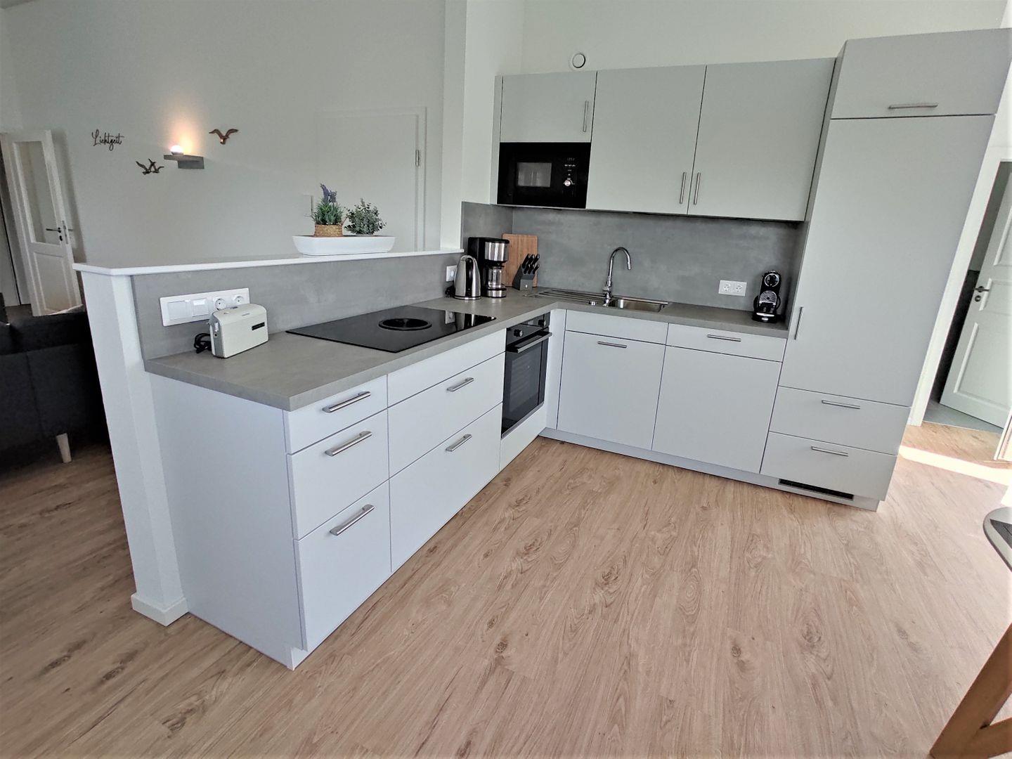 Der sehr schicke Wohnbereich ist mit bequemen, stylischen Wohnzimmermöbeln eingerichtet. Ebenso befindet sich in dem Raum ein Esstisch, an dem man sich bei gutem Essen und netten Gesprächen gerne nieder lässt. Auch die hochwertige, komplett, mit Induktionsherd, Nesspressomaschine, Bora- Abzug u.v.m., ausgestattete Küche im Wohnbereich lässt keine Wünsche offen.